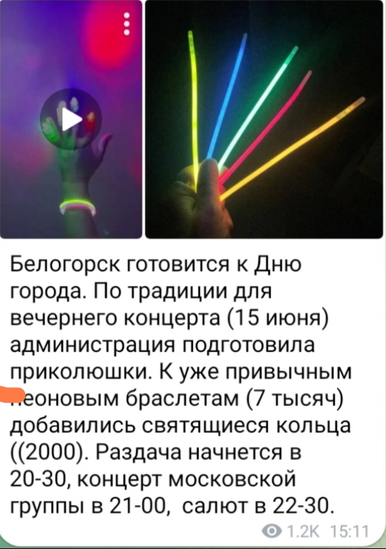 День города, наряду с другими праздниками в нашей стране самый большой по размаху подготовки праздник. В этот день проводятся праздничные мероприятия, выступления, народные гуляния, концерты, а так же раздача сувенирной продукции. Волонтёры будут раздавать в 2024 году на день города не только светящиеся браслеты, но и светящиеся колечки жителям и гостям Белогорска.