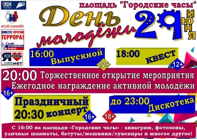 В рамках празднования Дня молодёжи пройдет концерт и дискотека на площади "Городский часы". Молодёжь ждёт награждение самых активных, веселье, фотозоны, танцы, интересные активности. Это праздник молодых, активных, креативных.