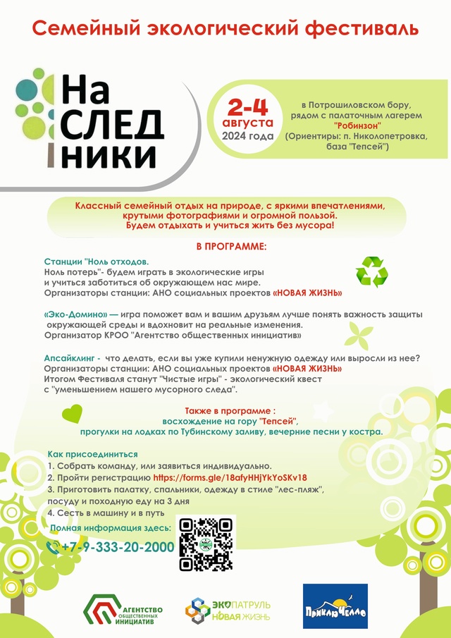 Мы приглашаем семьи с активной жизненной позицией к эковолонтёрской деятельности, направленной на улучшение окружающей среды своего края. Кроме того, мы готовим для участников Фестиваля интерактивные просветительские и игровые площадки для повышения их экологической грамотности, продвижения идеи разумного потребления и уменьшения своего "мусорного следа".