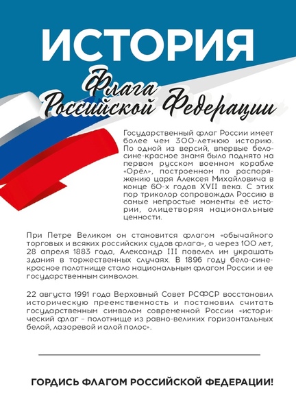 День Российского флага–это праздник всех поколений россиян, дань уважения истории великой страны. Трехцветный стяг неразрывно связан со становлением Российского государства, он стал символом военных побед и достижений. Ежегодно 22 августа все россияне празднуют день государственного флага Российской Федерации. В честь данного праздника, предлагаем присоединиться к акции «Флаги России». Волонтеры Победы совместно с ДШИ проведут Мастер-класс по изготовлению Российского флага и поздравительной открытки. «Я люблю Россию»