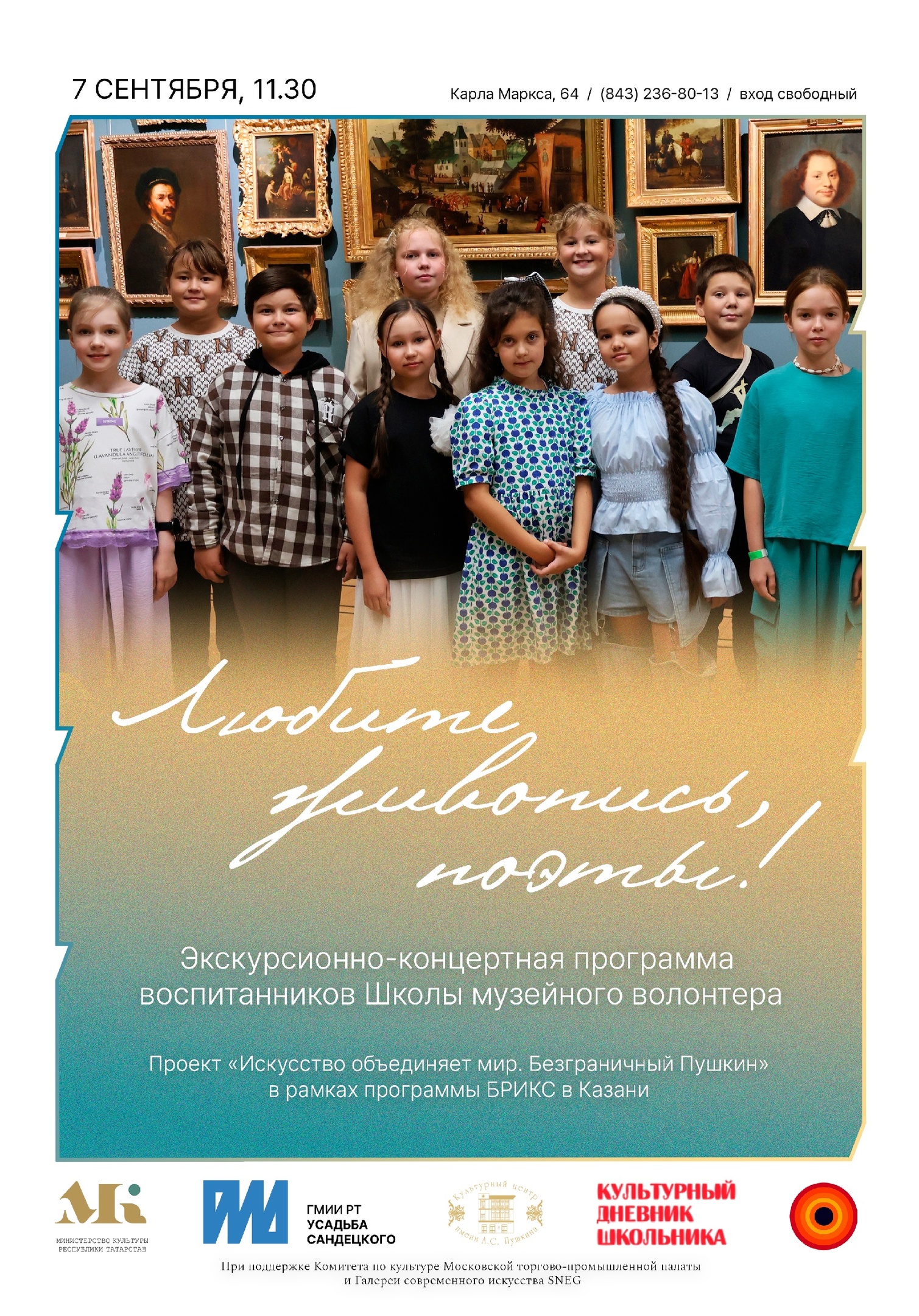 В Государственном музее изобразительных искусств Республики Татарстан состоится экскурсионно-концертная программа воспитанников Школы музейного волонтера "Любите живопись, поэты!". Это событие является частью проекта «Искусство объединяет мир. Безграничный Пушкин» в рамках программы БРИКС в Казани.