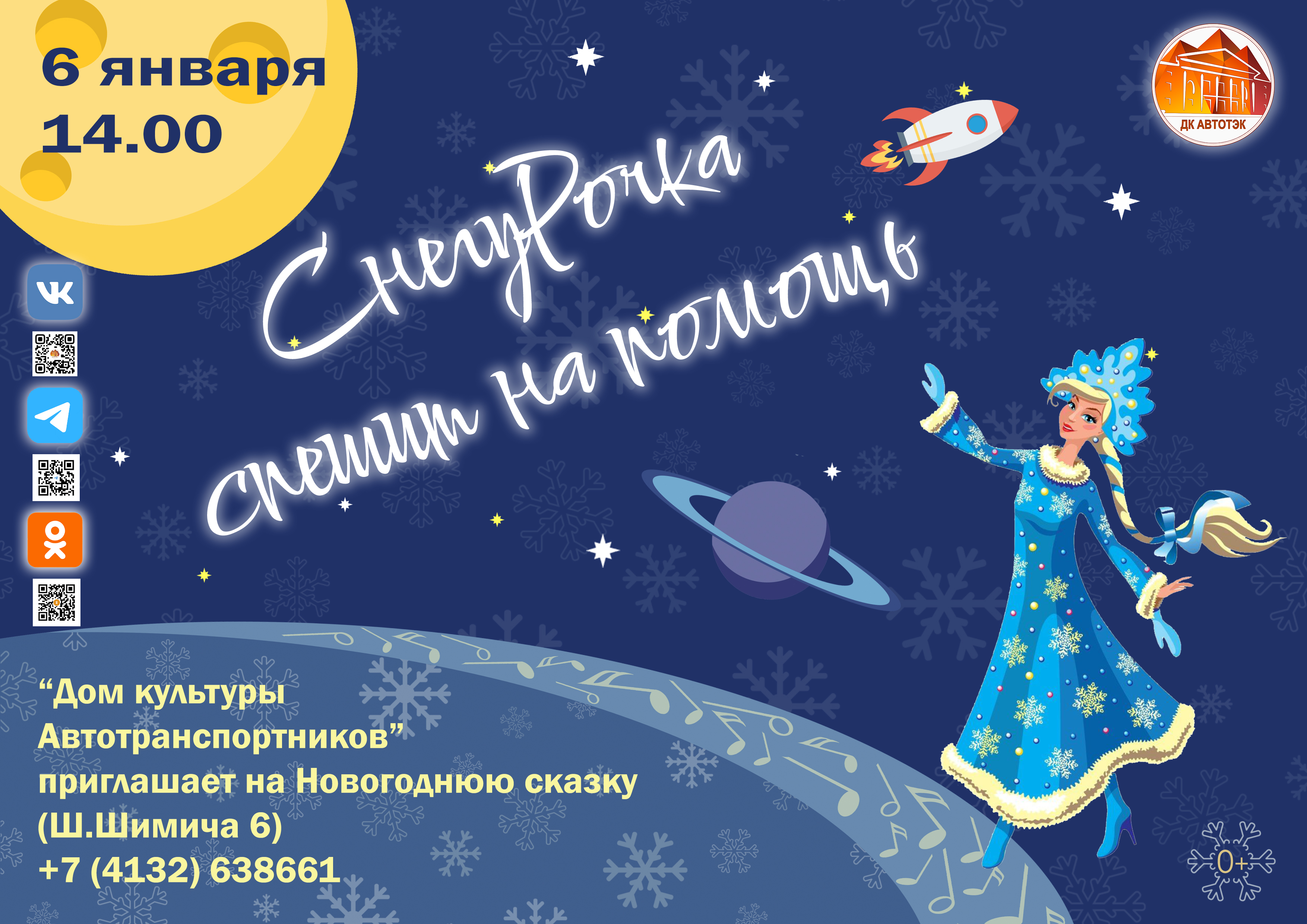 В новогодние праздники Дом культуры «Автотэк» преобразится в сказочный теремок, где юных зрителей ждут самые настоящие чудеса и волшебные открытия. Путешествие по загадочным планетам Системы Муз, сражение с Космическим Роботом и встреча с самыми главными новогодними героями… Ребятам предстоит пройти серьезные испытания, что бы помочь Снегурочке в ее «космической миссии» - спасении жителей творческих планет Системы Муз от злого космического робота. И, конечно же, «приятным бонусом за невероятные приключения» будет зажигательная игровая программа с Дедом Морозом и Снегурочкой у Новогодней Елки.