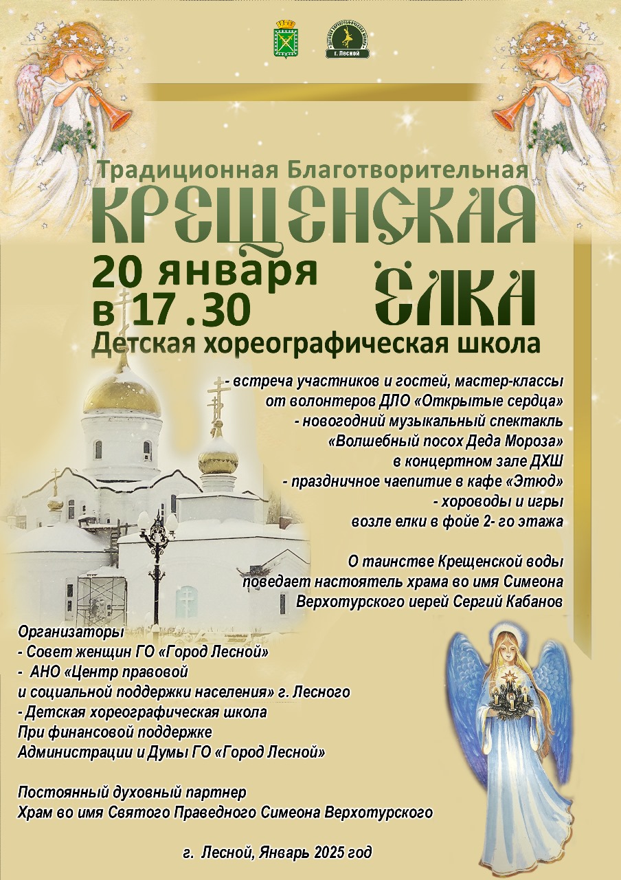 Городская благотворительная Крещенская елка,ежегодно проводимая женсоветом ГО "Город Лесной" совместно с Детской хореографической школой и волонтерами культуры из числа ДЛО "Открытые сердца("СКДЦ"Современник") и храмом во имя Симеона Верхотурского для детей из социально незащищенных семей города Лесного
