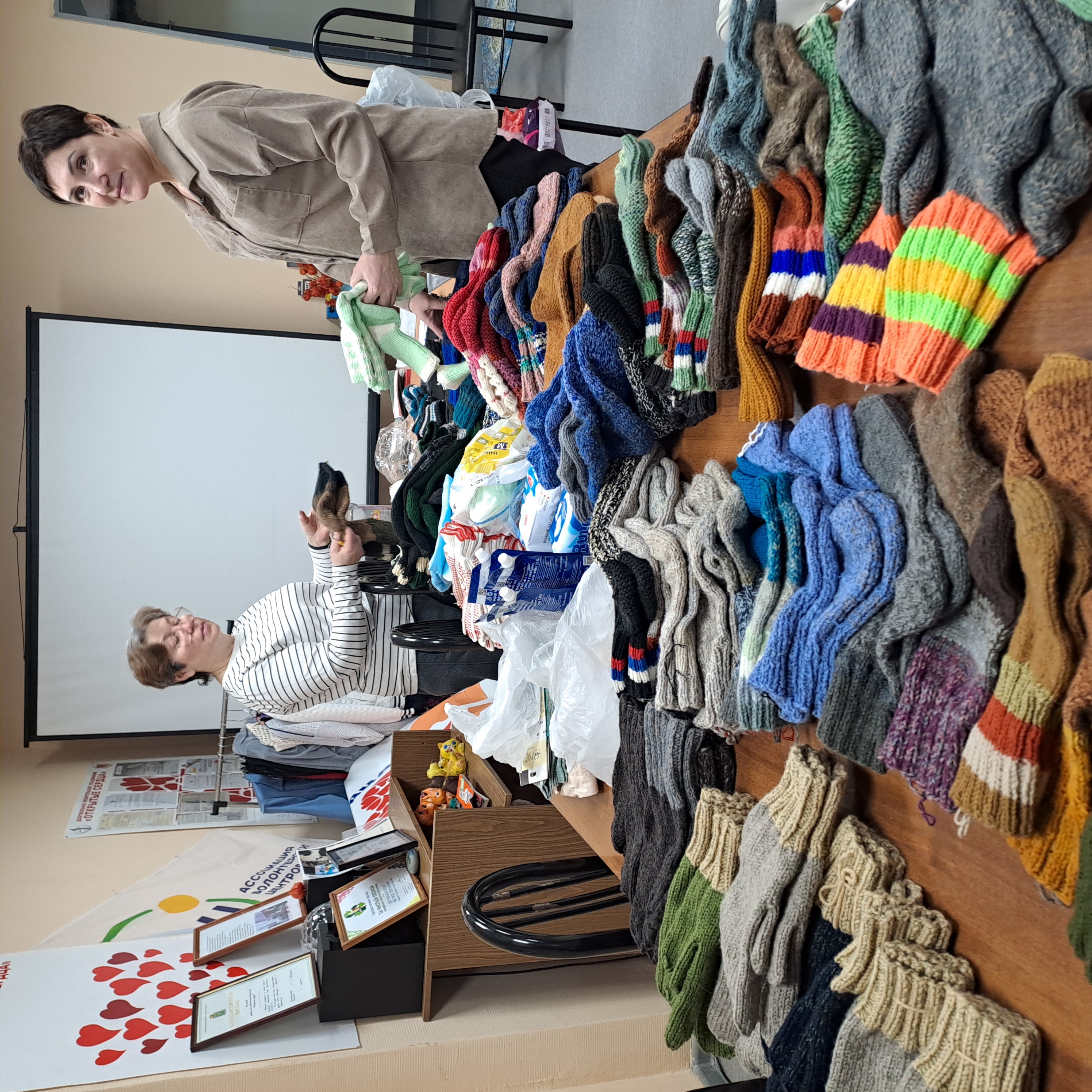 Проведение мастер-класса волонтерами ДЛО "Открытые сердца" по вязанию носков для защитников, находящихся в зоне СВО. С приглашением в стены клуба в СКДЦ "Современник" жителей города из числа старшего поколения и молодежи