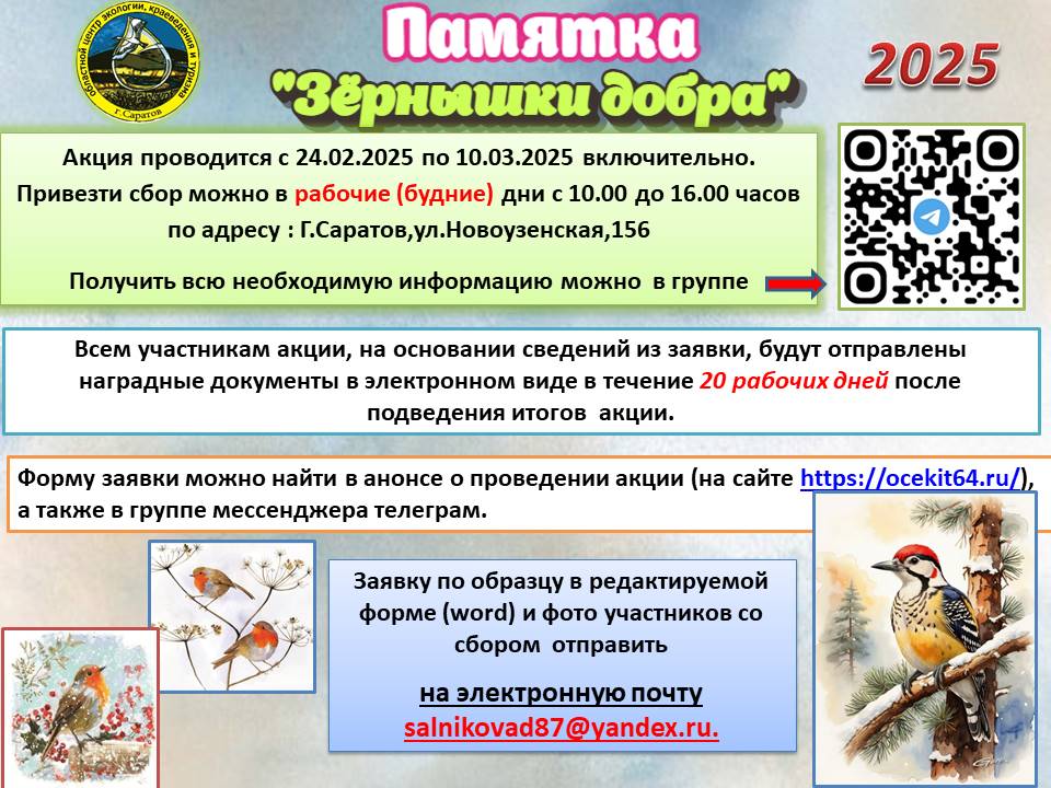 В ГБУ СОДО «ОЦЭКИТ» стартует ежегодная региональная акция помощи птицам «Зёрнышки добра-2025». Её цель: сбор корма для птиц, систематическое пополнение кормушек собранным в ходе акции кормом.