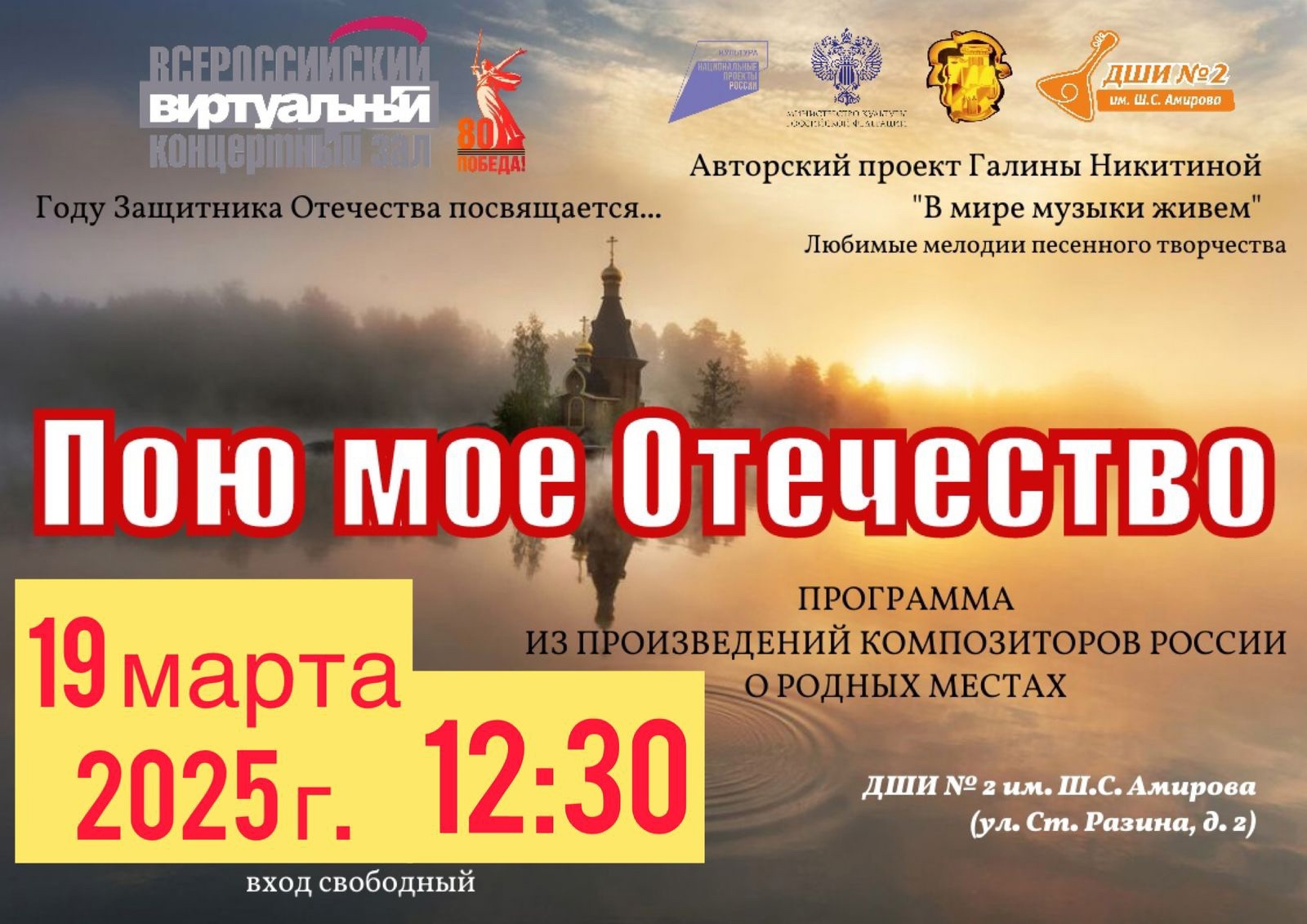 Приглашаем вас на уникальный показ авторского проекта Галины Никитиной - В мире музыки живем. Программа "Пою мое Отечество". Мероприятие состоится 19 марта в 12:30 в рамках Виртуального концертного зала! Это мероприятие обещает быть незабываемым и трогательным, погружающим нас в мир музыки, вдохновения и любви к Родине.
