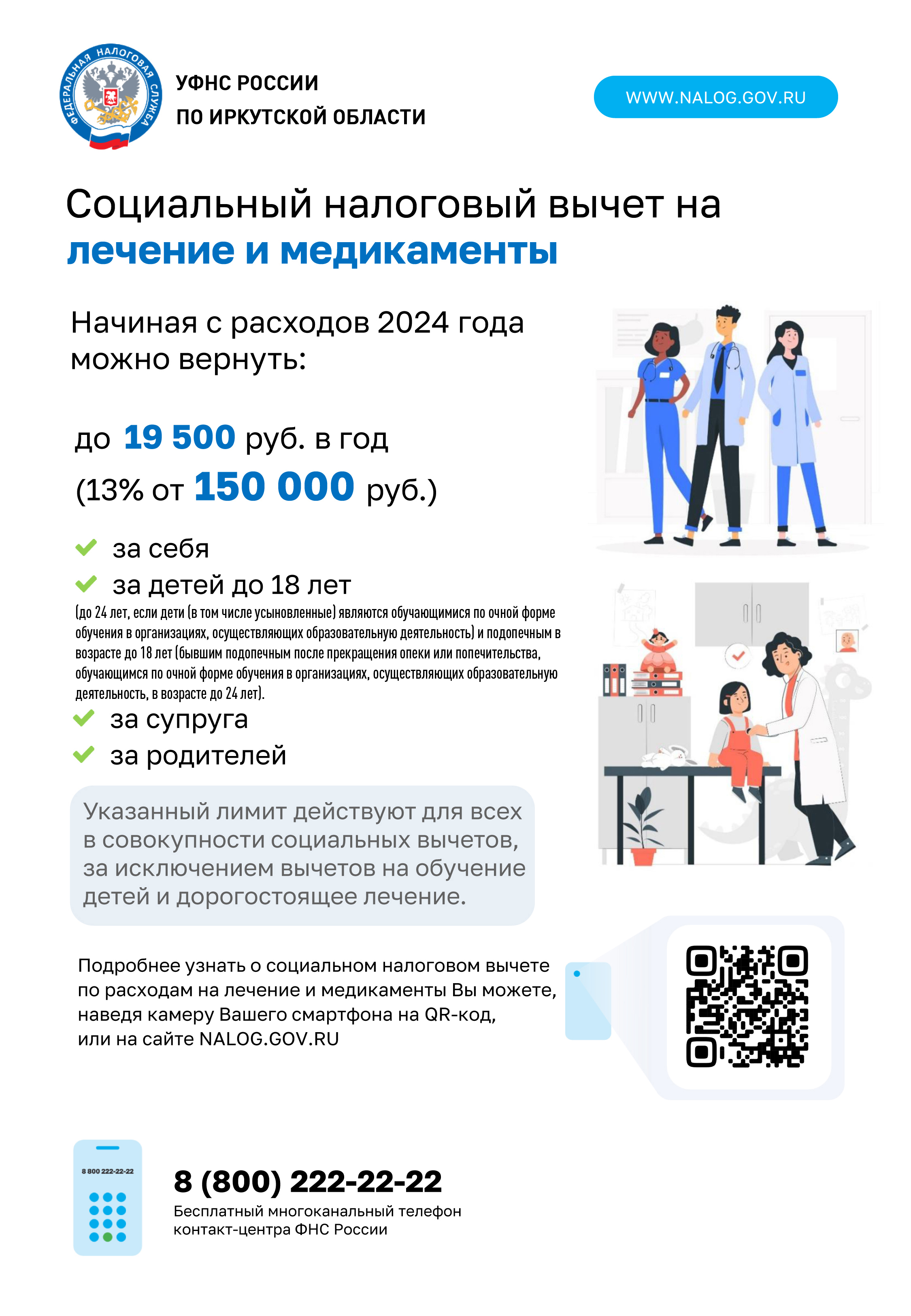 Социальный налоговый вычет на лечение и медикаменты. Начиная с расходов 2024 года можно вернуть: до 19 500 рублей в год (13% от 150 000 рублей). За себя, за детей до 18 лет (до 24 лет, если дети являются обучающимися по очной форме обучения), за супруга, за родителей.