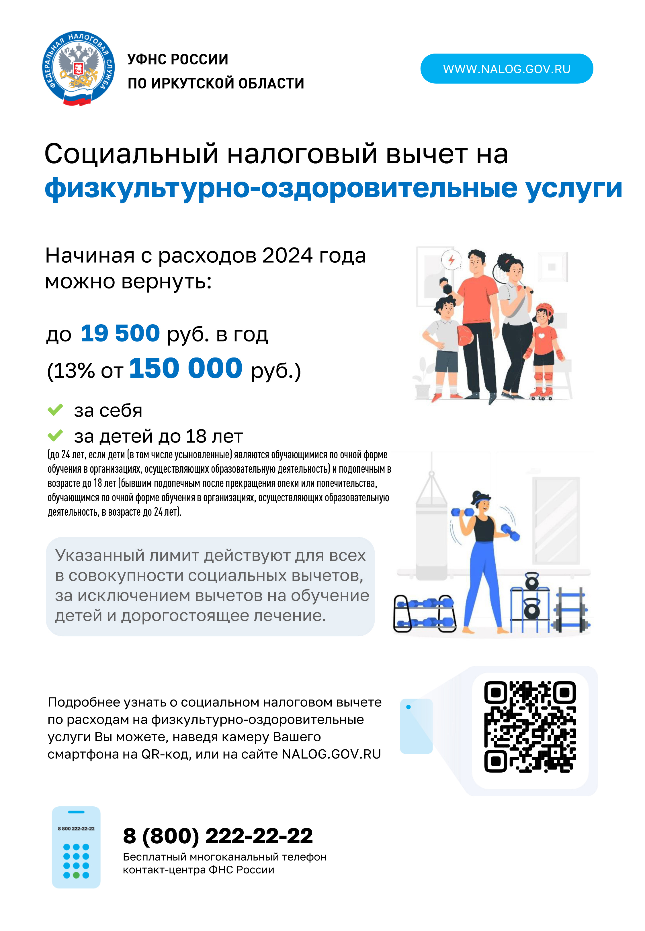 Социальный налоговый вычет на физкультурно-оздоровительные услуги. Начиная с расходов 2024 года можно вернуть: до 19 500 рублей в год (13% от 150 000 рублей), за себя, за детей до 18 лет (до 24 лет, если дети являются обучающимися по очной форме обучения).