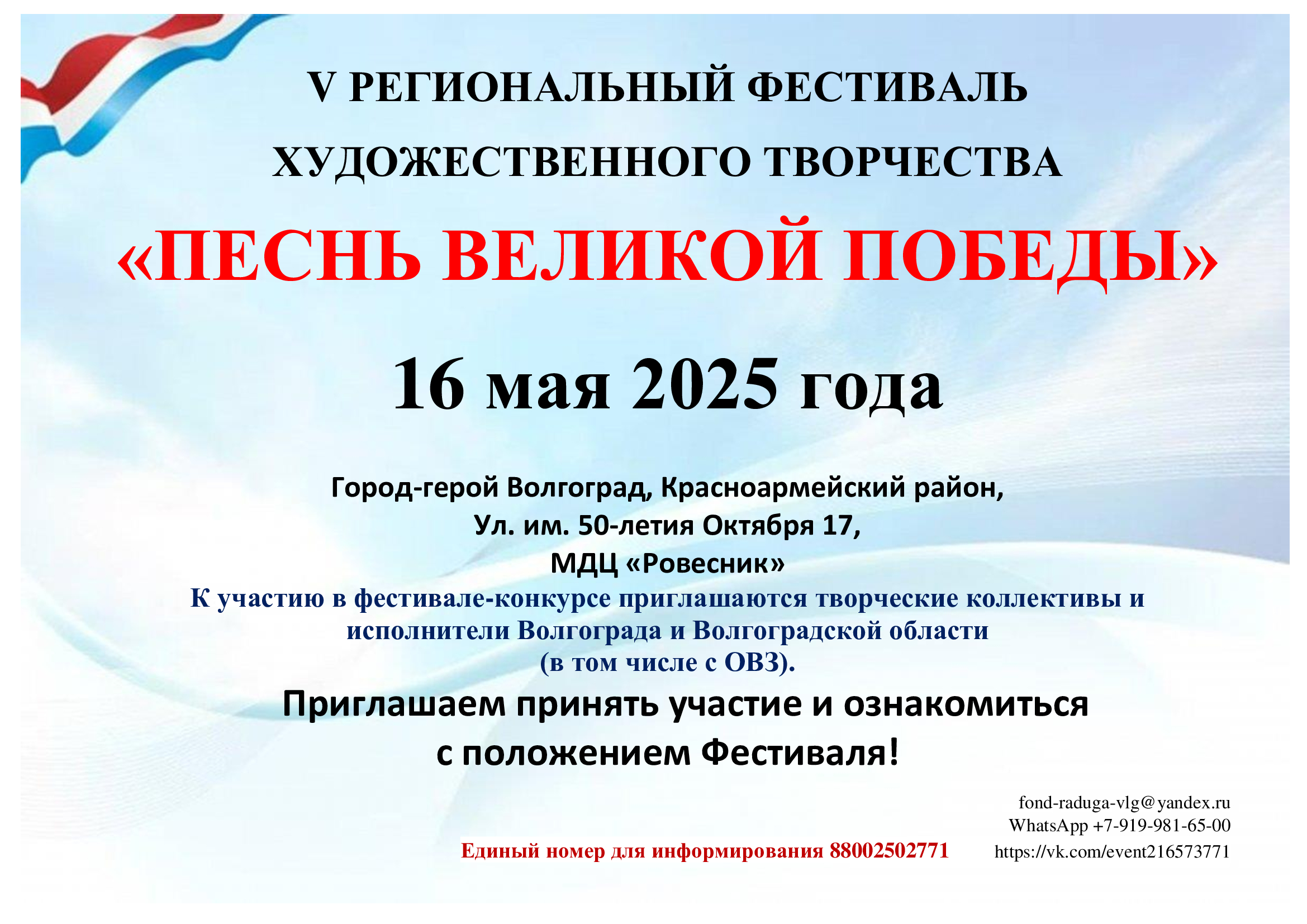 На сцене МДЦ «Ровесник» Красноармейского района Волгограда, по адресу ул 50-летия Октября, 17 состоится ежегодный Региональный патриотический фестиваль «Песнь великой Победы» с участием творческих детско- юношеских коллективов Волгограда, ребят с ограниченными возможностями здоровья, творческих коллективов и исполнителей Волгограда и Волгоградской области, посвященный Дню Победы