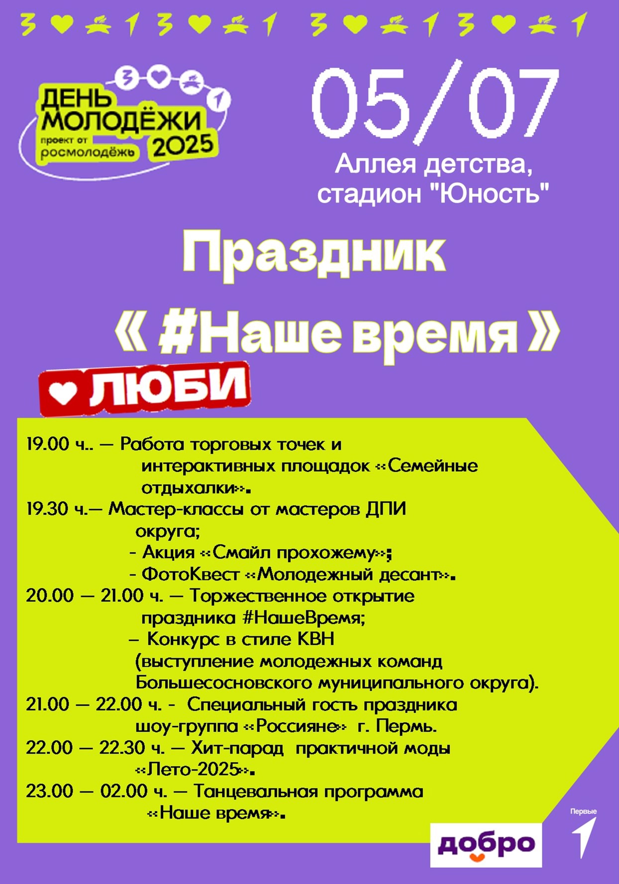 Праздник для молодежи в рамках Всероссийского Дня молодежи и проекта РОСМОЛОДЕЖЬ 2025. В программе: мастер-классы от мастеров ДПИ округа; акция "Смайл прохожему"; ФотоКВЕСТ "Молодежный десант"; концертная программа; конкурс в стиле КВН (молодежные команды округа); хит-парад практичной моды "Лето - 2025"; вечерняя танцевальная программа "Наше время"; специальный гость праздника шоу- группа "Россияне".