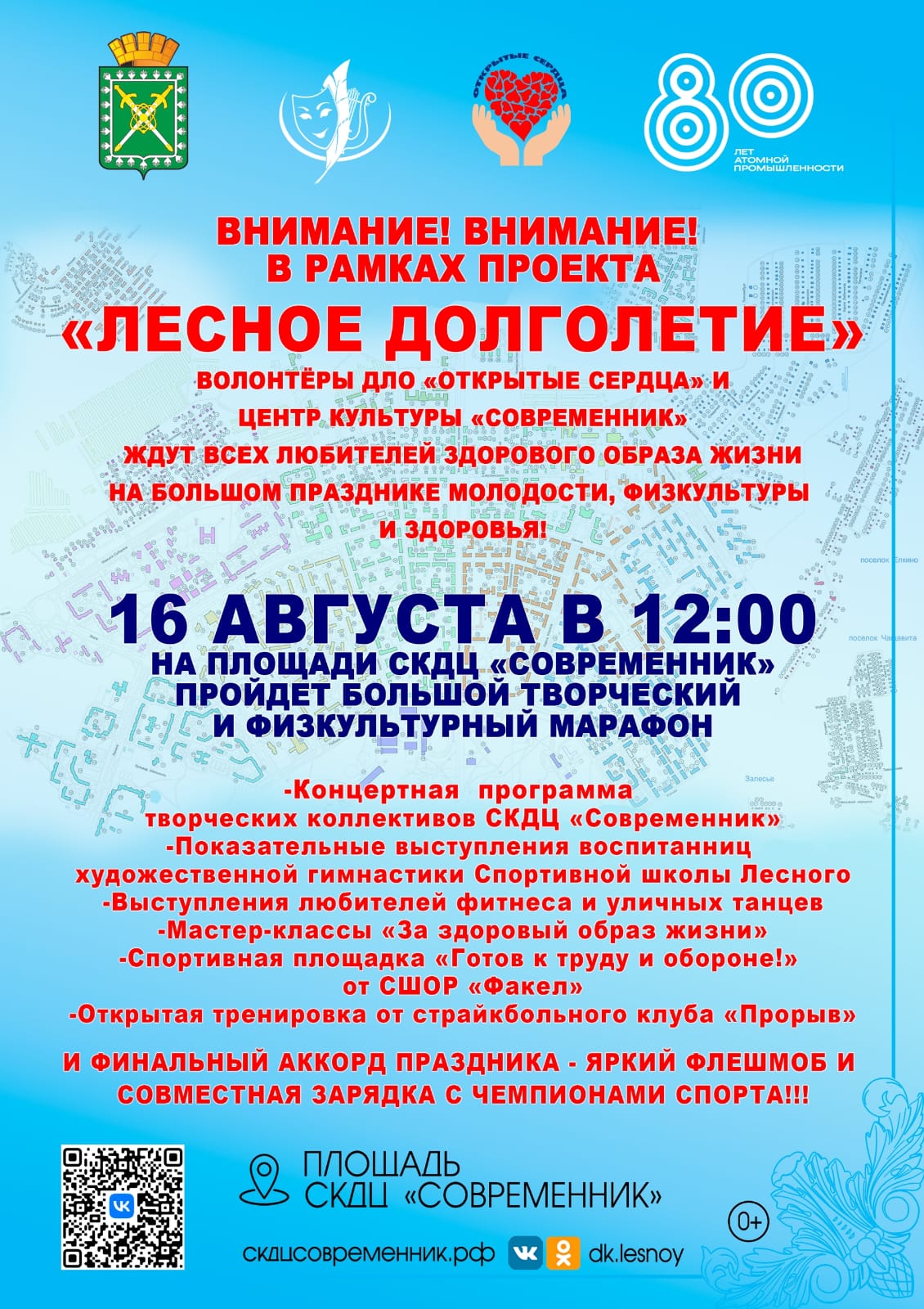 Ежегодное традиционное мероприятие, приуроченное к всероссийскому Дню физкультурника и в этом году посвященное двум юбилеям: 80-летию Великой Победы и 80-летию атомной промышленности состоится в эту субботу 16 августа в 12 часов на площади центра культуры «Современник». В ходе праздничного мероприятия пройдут показательные выступления гимнасток Спортивной школы Лесного, общественных объединений, популяризирующих ЗОЖ, развитие спорта и физической культуры в городе Лесном. Состоится концерт творческих коллективов СКДЦ "Современник" и обмен добровольческими практиками в ходе работы площадок партнеров проекта ДЛО "Открытые сердца" с символическим названием "Лесное долголетие"". Популяризировать тему сдачи нормативов ГТО будут волонтеры спорта СШОР «Факел» и волонтеры культуры города. Оказанию помощи защитникам СВО и развитию военно- спортивного воспитания молодежи посвящены работа площадок страйкбольного клуба "Прорыв", волонтерского объединения "МаскСети -Лесной" и ДЛО "Открытые сердца".