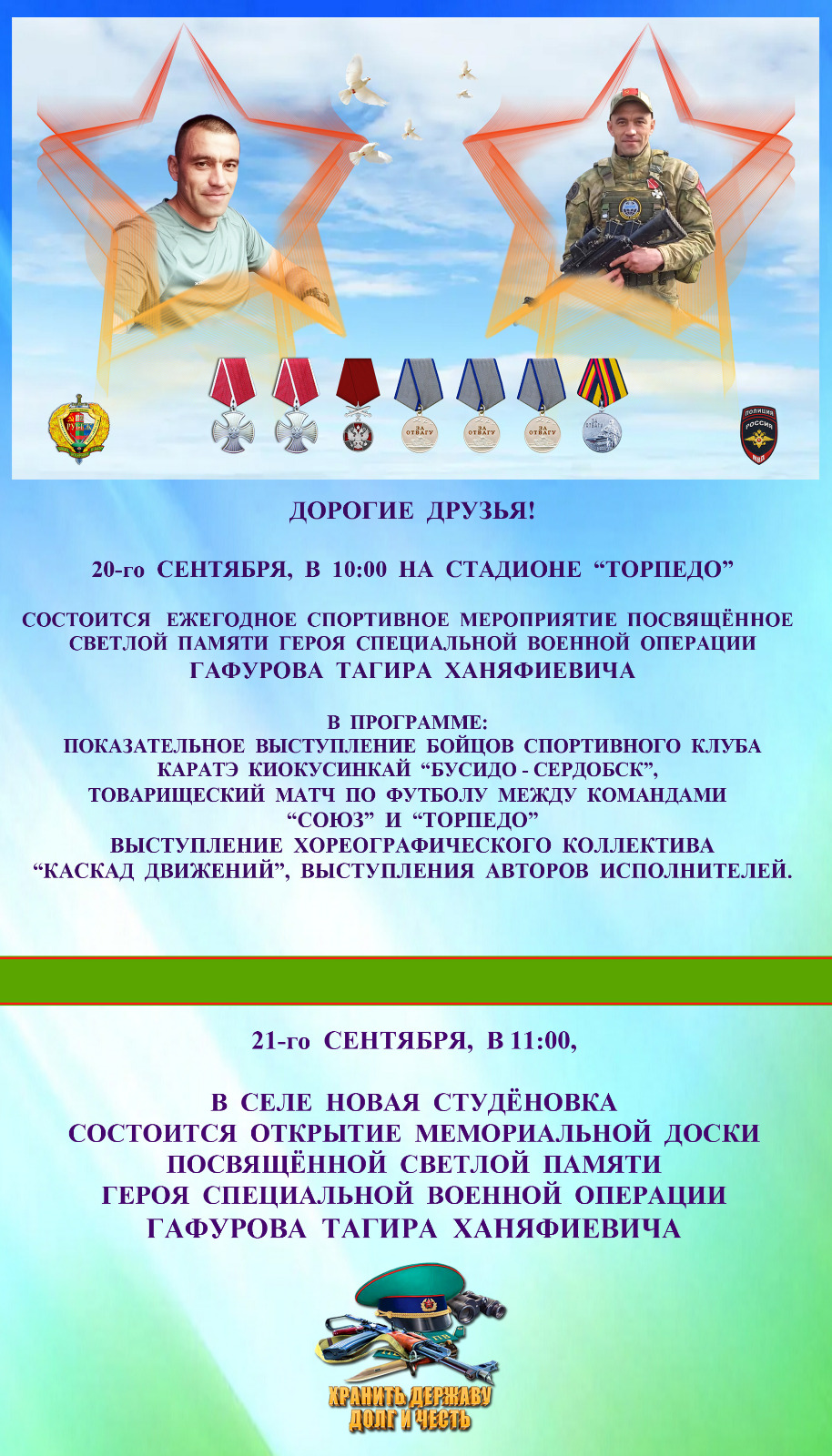 В программе спортивного праздника, посвященног памяти Героя СВО Гафурова Тагира Ханяфиевича будут проведены спортивно-массовые мероприятия: футболный матч между командами " Союз" и " Торпедо", показательные выступления воспитанников клуба " БУСИДО - СЕРДОБСК" ,хореографическая компазиция коллектива " Каскад движений".