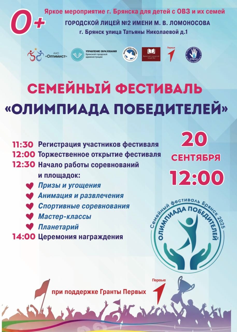 Оказание помощи в организации и проведении Семейного Фестиваля "Олимпиада Победителей" для детей с ОВЗ и их семей. Организация и проведение легкоатлетических забегов, привлечение ребят с ОВЗ к двигательной активности на станциях Муравейника. "Зарядка с Чемпионом!"