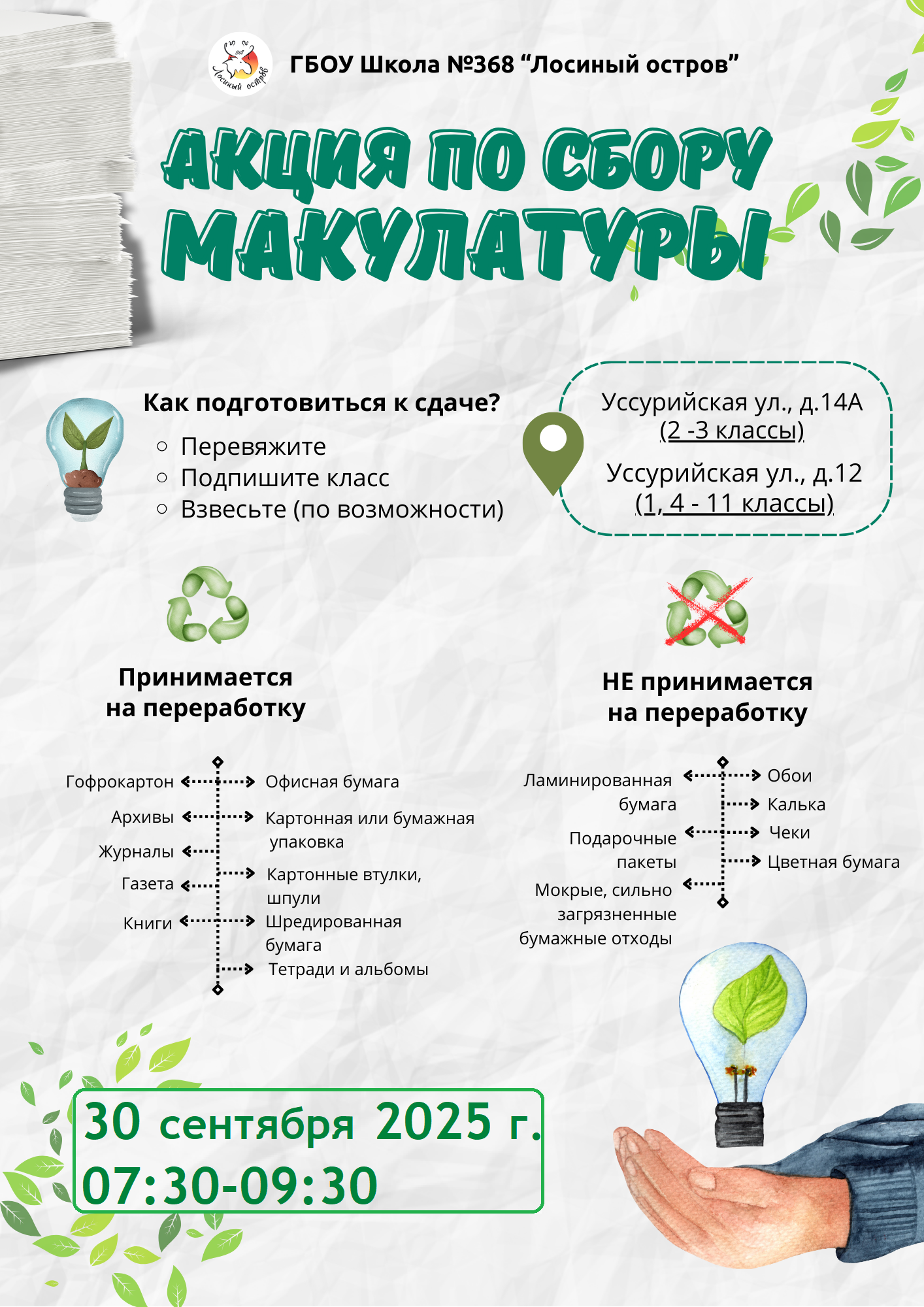• Баллы для класса: Класс, собравший больше всего макулатуры, получит дополнительный приз.