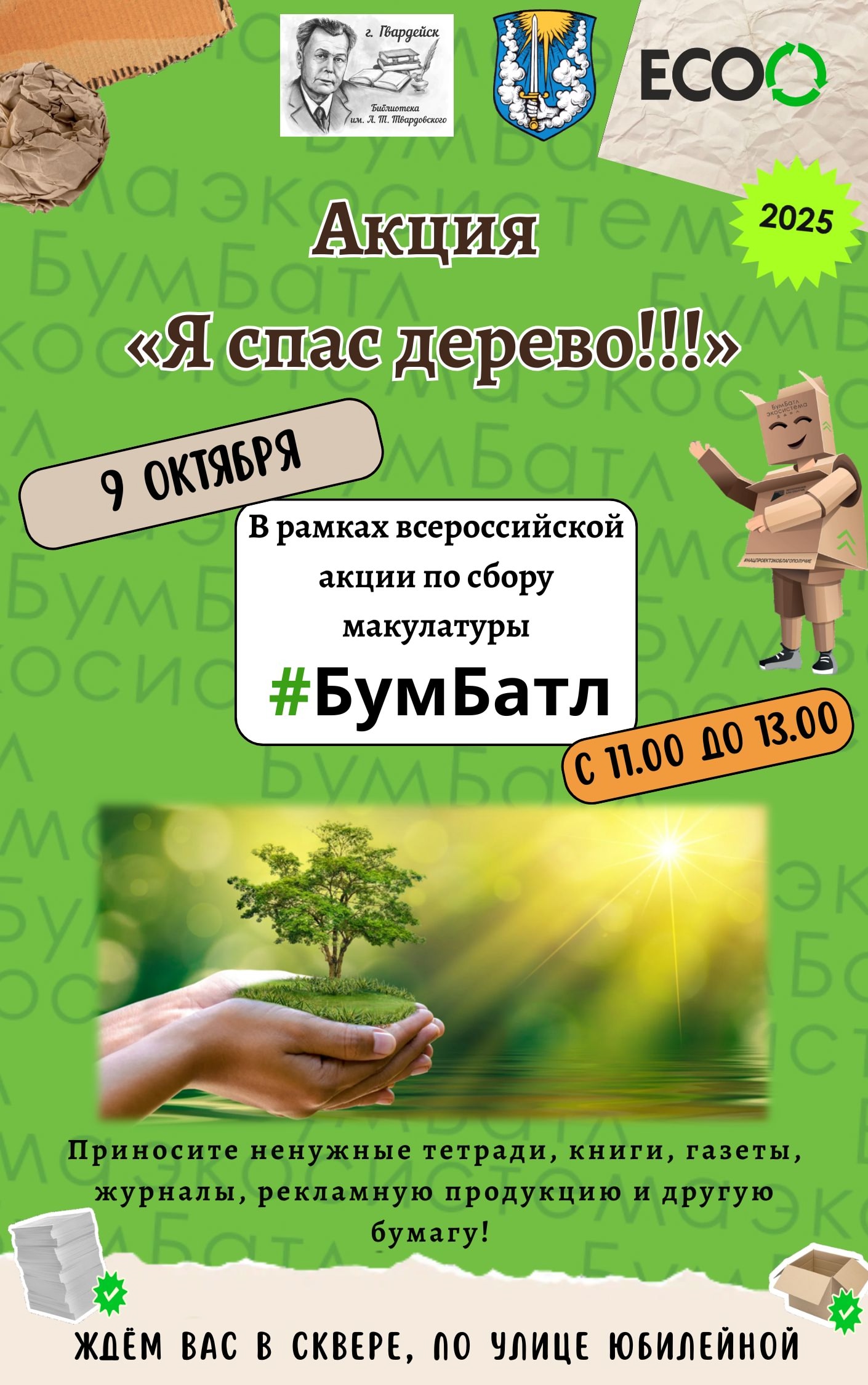 Акция по сбору макулатуры для жителей Гвардейского муниципального округа. Волонтеры будут помогать принимать макулатуру, взвешивать и передавать переработчику, раздавать наклейки-стикеры "Я спас дерево".