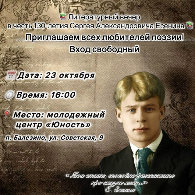Ведущей этого вечера станет Дерендяева Софья, ученица 9 класса школы №5, которая проведет вас сквозь волшебный мир есенинской лирики.Цели мероприятия