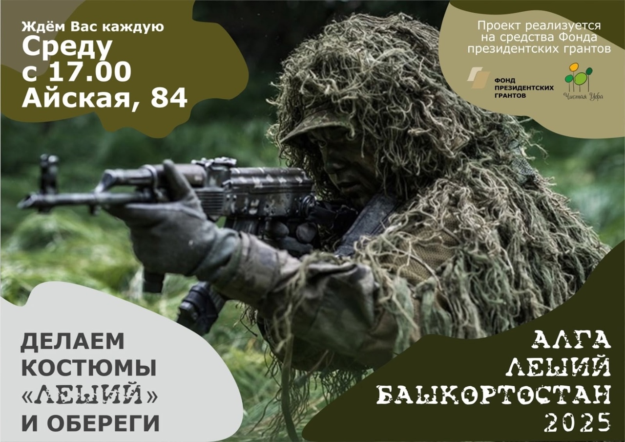 Патриотический проект "Алга Леший Башкортостан 2025" по созданию маскировочных защитных костюмов "ЛЕШИЙ" для снайперов и разведчиков- участников СВО Башкирских добровольческих батальонов и созданию оберегов для бойцов СВО. Приглашаем всех желающих помочь сохранить здоровье нашим защитникам и приблизить их возвращение домой живыми в Республику Башкортостан.