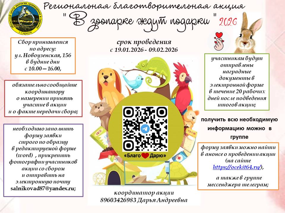 Наш мини-зоопарк – особое пространство, где каждый гость имеет уникальную возможность познакомиться с удивительным миром животных прямо посреди городской суеты. Здесь проживают птицы, грызуны, рептилии, пресмыкающиеся и млекопитающие, среди которых есть как привычные виды нашей Родины, так и редкие гости из дальних стран. В рамках акции помощь будет оказана и животным Саратовской региональной общественной благотворительной организации «Биосфера» (живой уголок в Детском парке г. Саратова). Живущие там питомцы с непростой судьбой: звери с травмами после ДТП, птицы с поврежденными крыльями. Есть среди них и те, кто попросту стал не нужен прежним хозяевам . Кого-то вылечивают и выпускают на свободу, кого-то пристраивают в зоопарки, а есть те, кто постоянно проживает там.