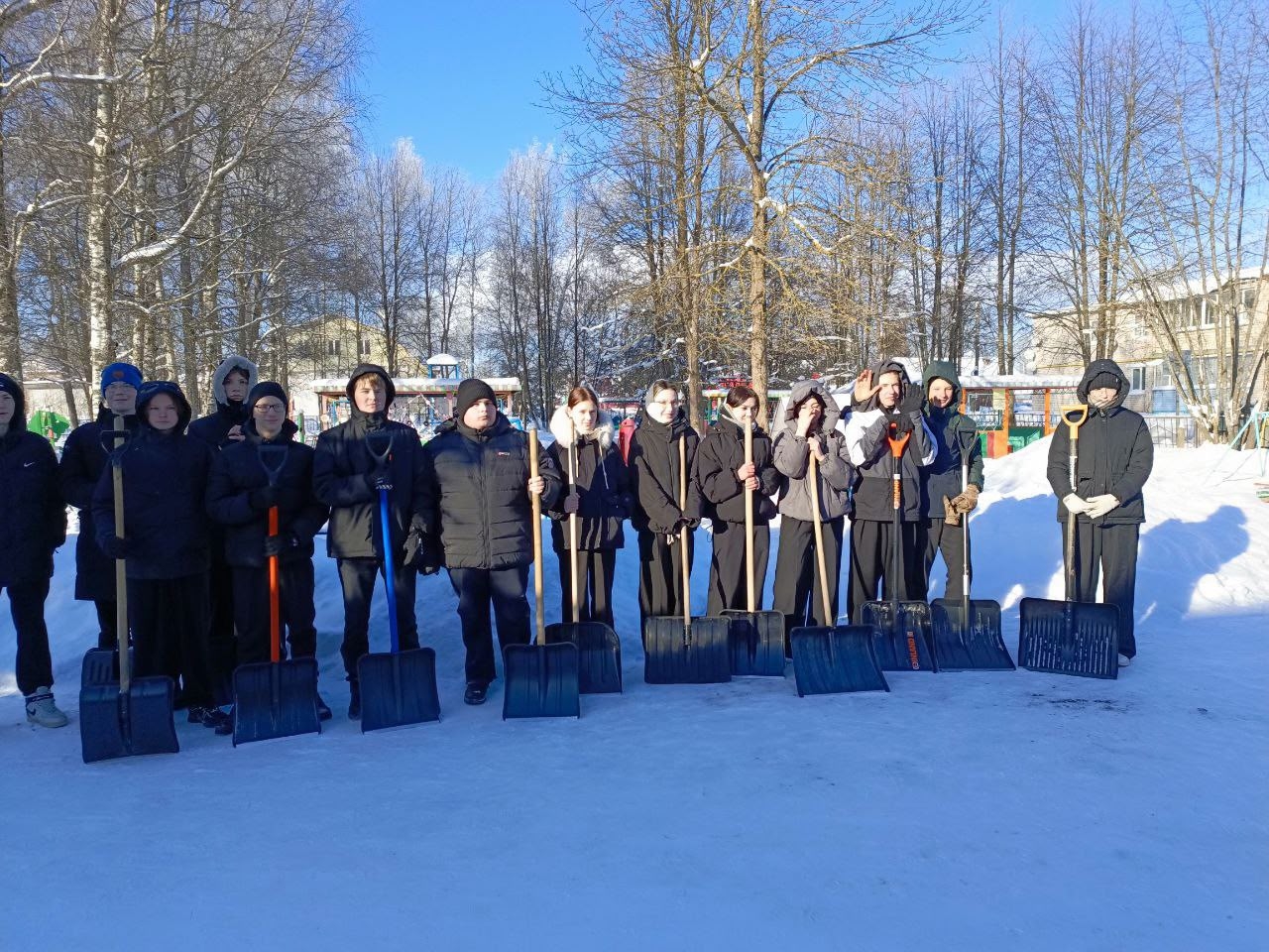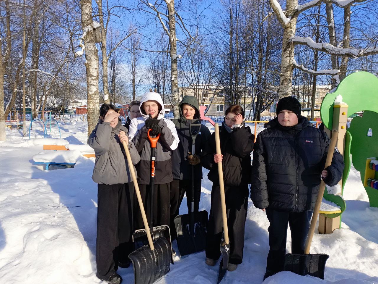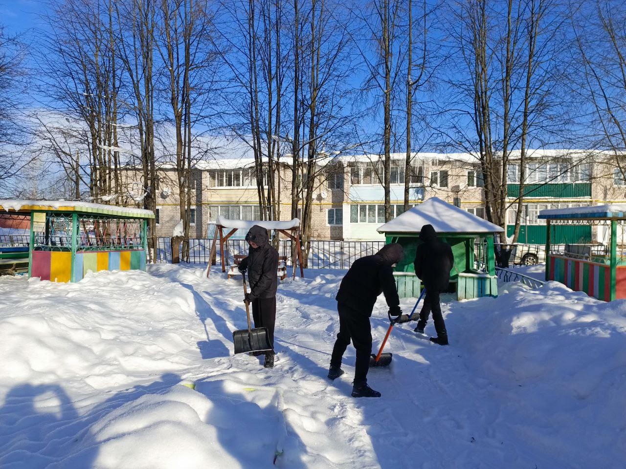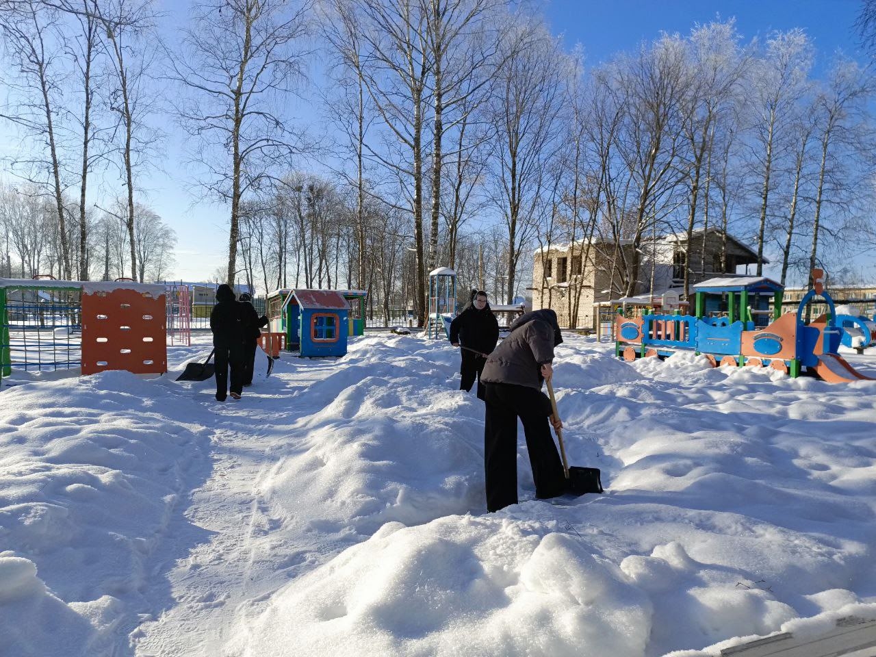 Добровольцы средней школы № 1 расчищают от снега прогулочные площадки и тропинки на территории детского сада "Ласточка". Ребята работают по мере необходимости. Расчищают нужные в данный момент прогулочные площадки.