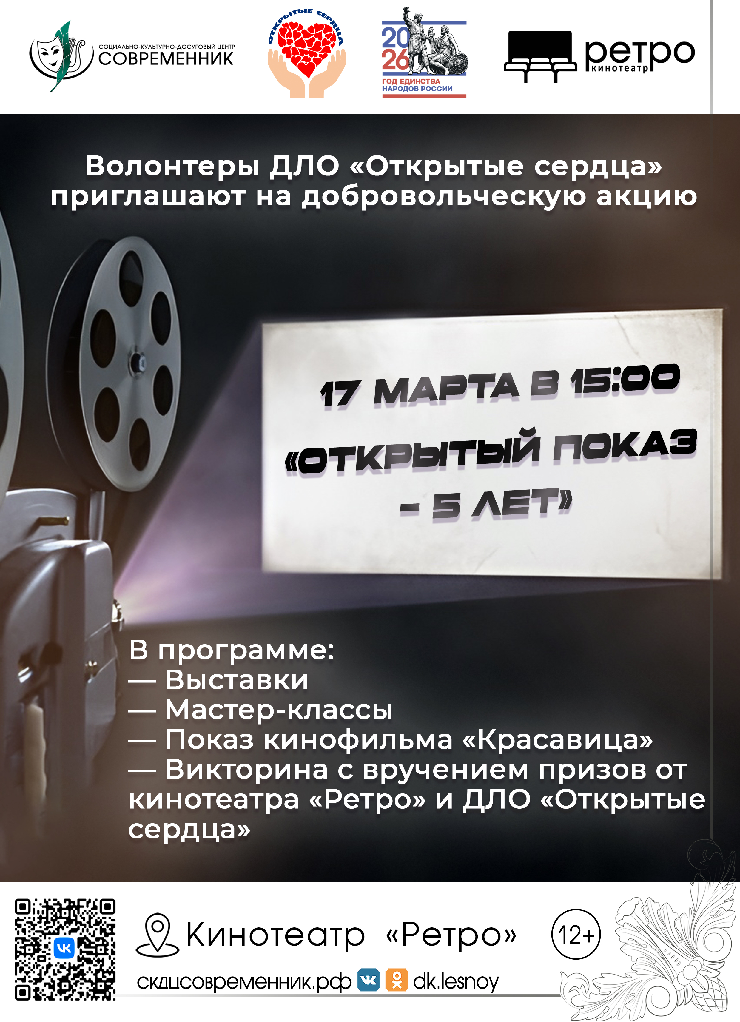 Организация и проведение добровольческой акции в честь 5-летия "Открытого показа"., которая состоится в кинотеатре "Ретро" перед показом кинофильма о подвиге людей в период Блокады Ленигграда. В ходе акции волонтеры ДЛО "Открытые сердца" проведут выставки и экспозиции , а также мастер -класс по изготовлению сухого армейского душа для защитников в зоне СВО. В акции примут участие партнеры проекта "Карта добрых дел"- волонтеры из ВПК "Разведчик" и православные следопыты из Симеоновского отряда "Братства православных следопытов".