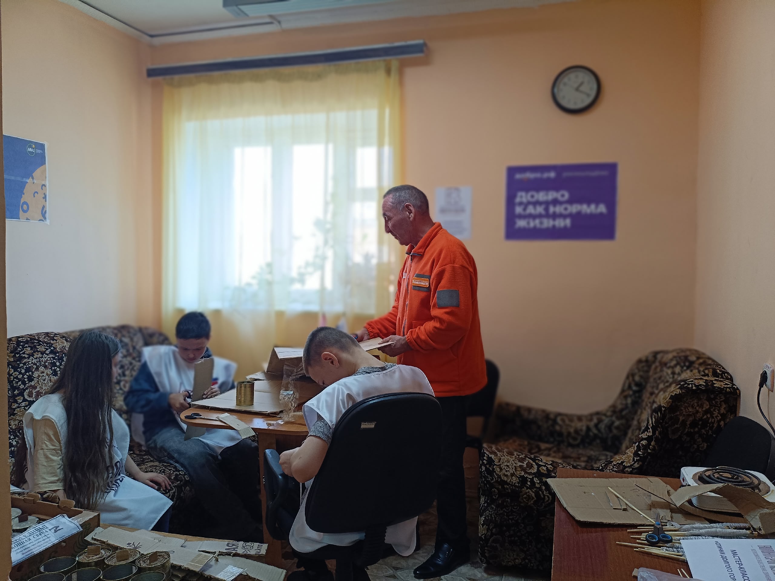 3 апреля на волонтёрской площадке организована "Полезная программа" в рамках Марафона добрых дел. Здесь участники не только осваивают новые навыки, но и вносят свой вклад в общее дело — в этот раз ребята учились делать окопные свечи. В перерывах между занятостью все вместе пили чай со сладостями, делились впечатлениями и просто приятно общались.