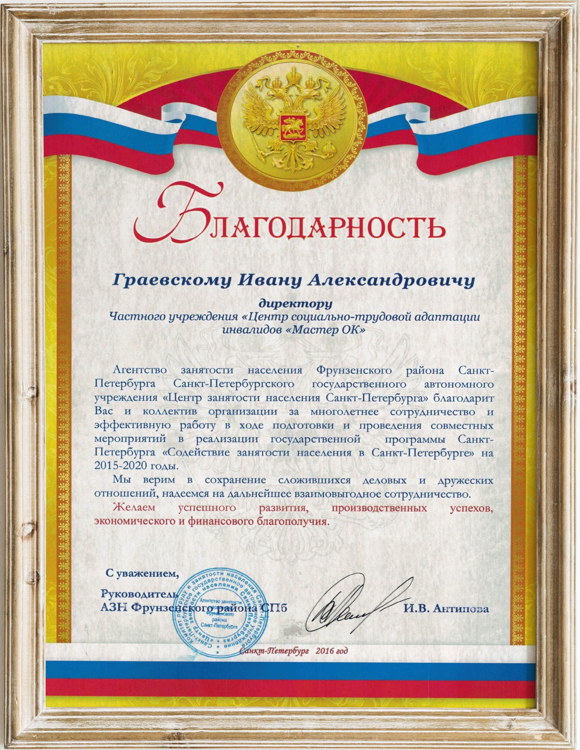 «Центр социально-трудовой адаптации инвалидов «Мастер ОК» - некоммерческая социально ориентированная организация, оказывающая на безвозмездной основе услуги социальной, бытовой и трудовой адаптации, а также помощь в трудоустройстве с дальнейшим курированием и психологические услуги для молодых людей с инвалидностью, в том числе и с интеллектуальными нарушениями, в Санкт-Петербурге. Центр также оказывает услуги консультационной поддержки работодателям сотрудников с инвалидностью и услуги консультационной и психологической поддержки для членов семей людей с инвалидностью.