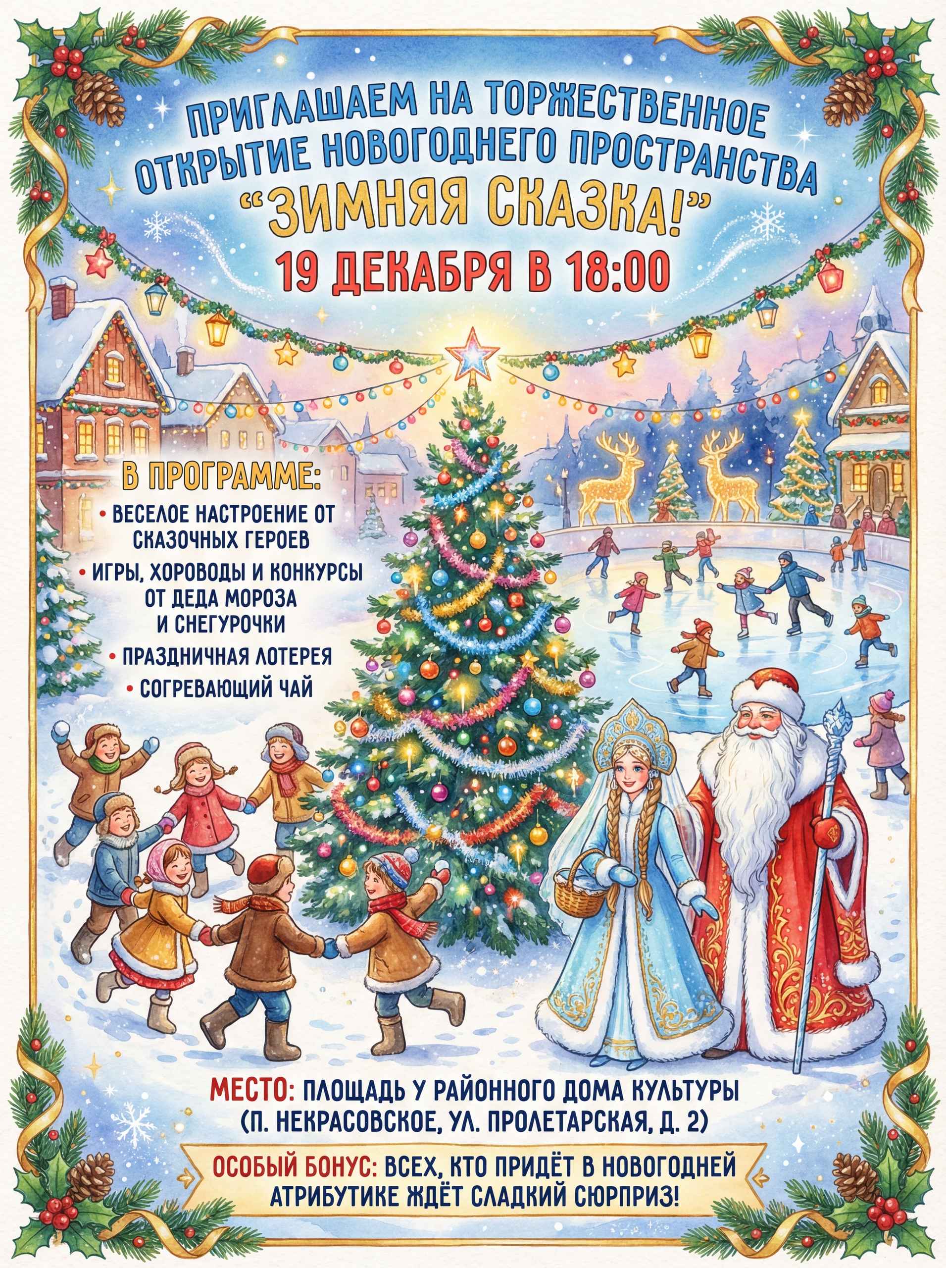 Зимняя сказка начинается! Друзья! Приглашаем вас на волшебное открытие новогоднего пространства «Зимняя сказка» у Дома культуры! Когда: 19 декабря (пятница) в 18:00