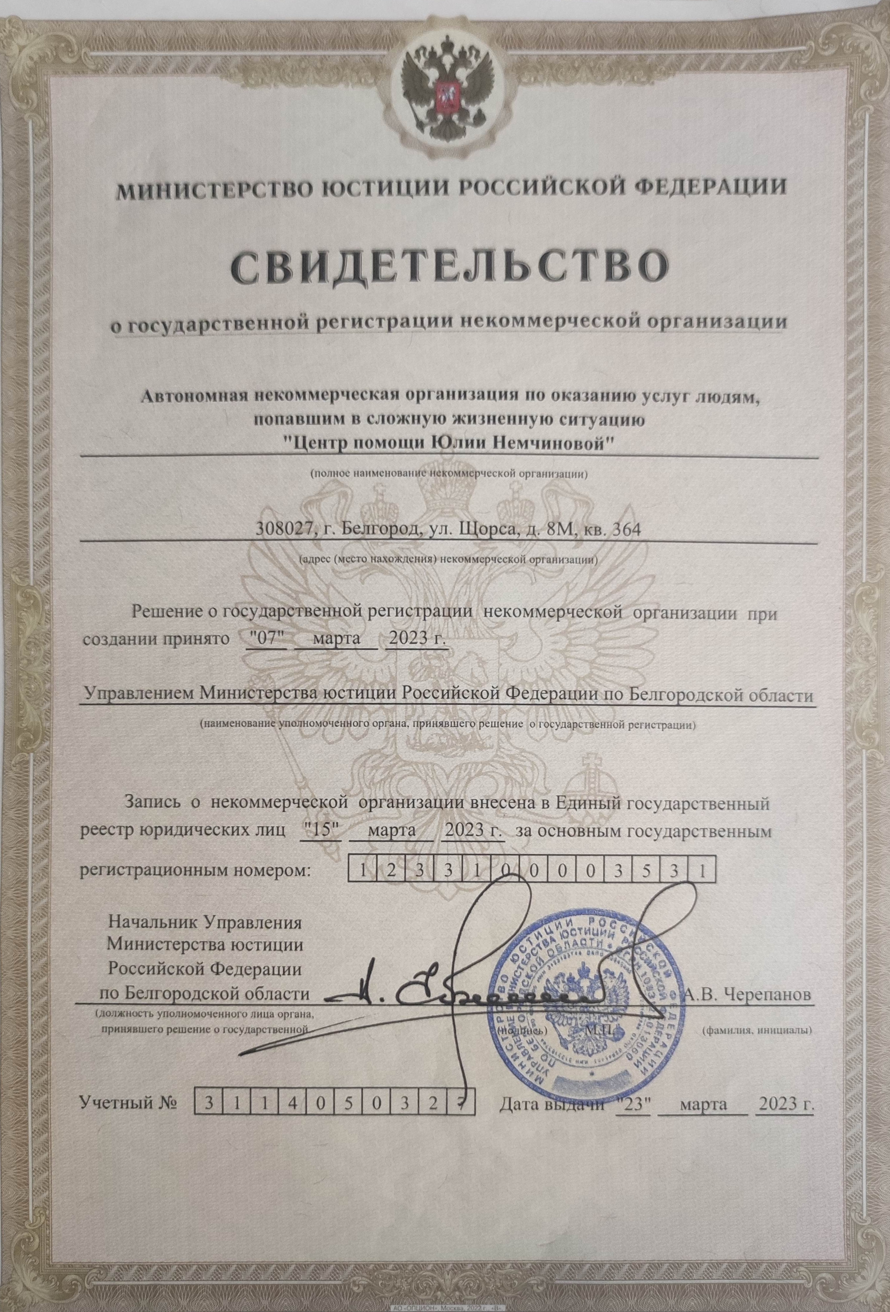 В 2023 году мы решили, что благотворительность уже для нас не просто волонтерство, а постоянная круглосуточная работа и профессиональная деятельность. В конце марта 2023 года открыли НКО- Автономная некоммерческая организация по оказанию услуг людям, попавшим в сложную жизненную ситуацию "Центр помощи Юлии Немчиновой"