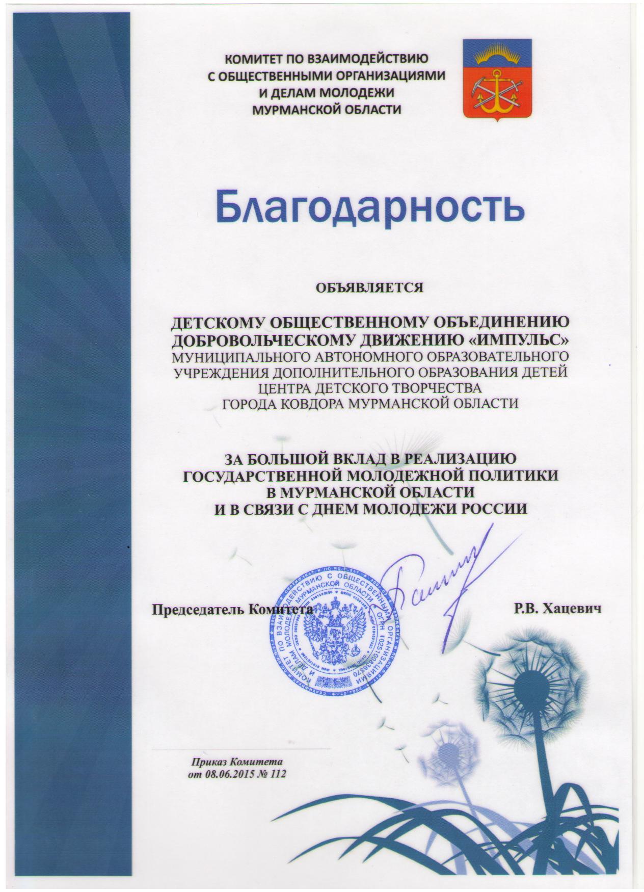 Деятельность добровольческого движения «Импульс» на территории Ковдорского района организована с сентября 2009 года и направлена на пропаганду здорового и безопасного образа жизни и вовлечение детей, подростков, молодёжи в социально-значимую деятельность. Организация акций, разработка и реализация социальных проектов, первичная профилактика употребления ПАВ в подростково - молодёжной среде по методике «равный – равному», профилактика ВИЧ/СПИДа – вот основные направления деятельности ДД «Импульс». Волонтёры ДД «Импульс» - это активные участники и помощники администрации Ковдорского муниципального округа в организации районных мероприятий, посвященных торжественным, памятным и праздничным датам. Входят с состав совета по реализации государственной молодёжной политике при главе муниципалитета, являются членами местного отделения Всероссийского общественного движения «Волонтёры Победы», членами антинаркотического волонтёрского движения Ковдорского муниципального округа. Самостоятельно проводят на территории муниципалитета большое количество различных социально-значимых акций и мероприятий. Ежегодно волонтёры успешно принимают участие во Всероссийских и областных конкурсах грантов, получая финансирование на реализацию социально-значимых инициатив. Волонтёрами «Импульса» разработаны и успешно реализуются социальные проекты «Живи ярко», «Добрые волшебники», «Мы выбираем жизнь», «Старость в радость», «Горячая линия», «Точка позитива», «Прекрасно, когда ты живёшь», «Я в теме», «Работает спецназ», «Тропою партизан», «Линия жизни», «Семейный движ» и др. С 2010 года волонтёры «Импульса» становятся лауреатами премии и стипендиатами Губернатора Мурманской области в номинации «За результативную общественно - полезную деятельность», с 2012 года лауреатами премии и стипендиатами администрации Ковдорского района в номинации «За результативную общественно - полезную деятельность». Добровольческое движение «Импульс» сотрудничает с ГОБУМП «Региональный центр патриотического воспитания и допризывной подготовки молодёжи», МКУ Управление образования Ковдорского муниципального округа, МКУ «Управление культуры Ковдорского муниципального округа», ГАПОУ МО «Ковдорский политехнический колледж», АНО «Спорткомплекс «Чайка», ГОАУЗ «Мурманский областной центр специализированных видов медицинской помощи», Ковдорским краеведческим музеем, Общественно-политической газетой Ковдорского района «Ковдорчанин», АНО ТРК «Север», Советом молодых специалистов АО «Ковдорский ГОК», Региональное отделение Всероссийского общественного движения «Волонтёры Победы» Мурманской области, МБУК «Централизованная библиотечная система», Центром по профилактике правонарушений несовершеннолетних ГОБУМО ЦППМС-помощи