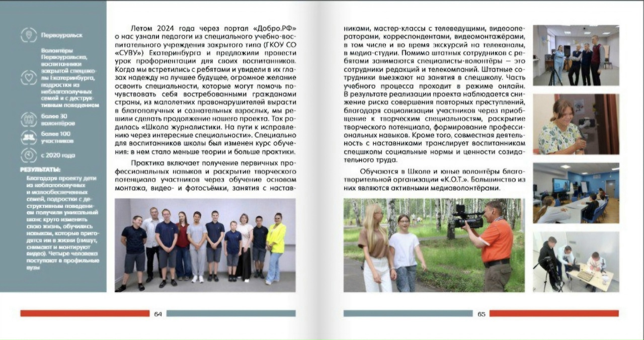 💫О проекте "Школа журналистики" рассказали в "Сборнике добровольческих практик в сфере культуры Свердловской области"️Традиционно (а именно - третий год подряд) нашу практику эксперты признают одной из лучших! И если в предыдущих сборниках о нас рассказывали исключительно как о победителях конкурса "Добро и воля" в номинации "Медиаволонтёрство", то в издании с итогами за 2025 год нашему проекту посвятили целых два разворота! Для нас это очень престижно и важно!