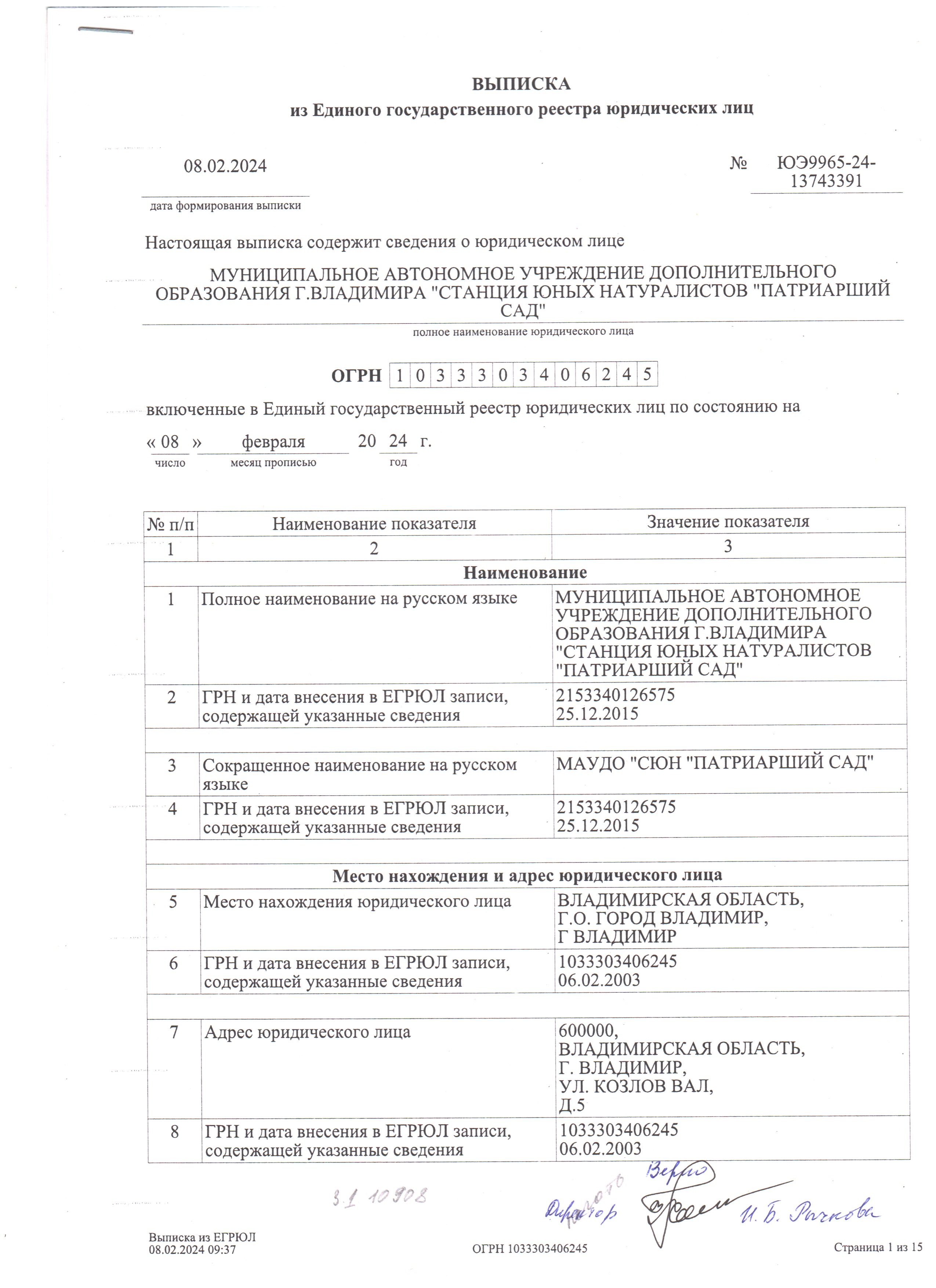 Показать всеМуниципальное автономное учреждение дополнительного образования г. Владимира "Станция юных натуралистов «Патриарший сад» - это одно из старейших учреждений системы дополнительного образования естественнонаучной направленности в г. Владимире. Учреждение является федеральной инновационной площадкой при президиуме Российской академии образования (свидетельство от от 29.06.2022 г. №2), реализует проект по теме: «Развитие воспитательного пространства дополнительного образования детей, школьников и молодежи, ориентированного на использование историко-культурного потенциала региона», реализует региональный инновационный проект "Конвергентный подход в дополнительном образовании детей". Является муниципальной Экостанцией, входит в Ассоциацию детских ботанических садов России.