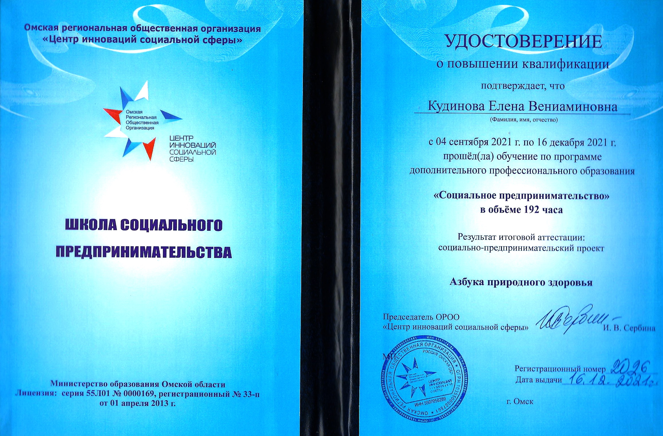 С 2000 по 2021г.г. занималась научно-экспериментальной деятельностью, разработала 8 авторских методик, которые внедряла в практику в ЦПР, проводя клиническую апробацию в рамках докторской диссертации. Полученные научные и практические в клинике результаты, а также сложная эпидемиологическая и экологическая обстановка, поспособствовали пройти 2021 г. школу социального предпринимательства и открыть ИП. Е.В.Кудинова.