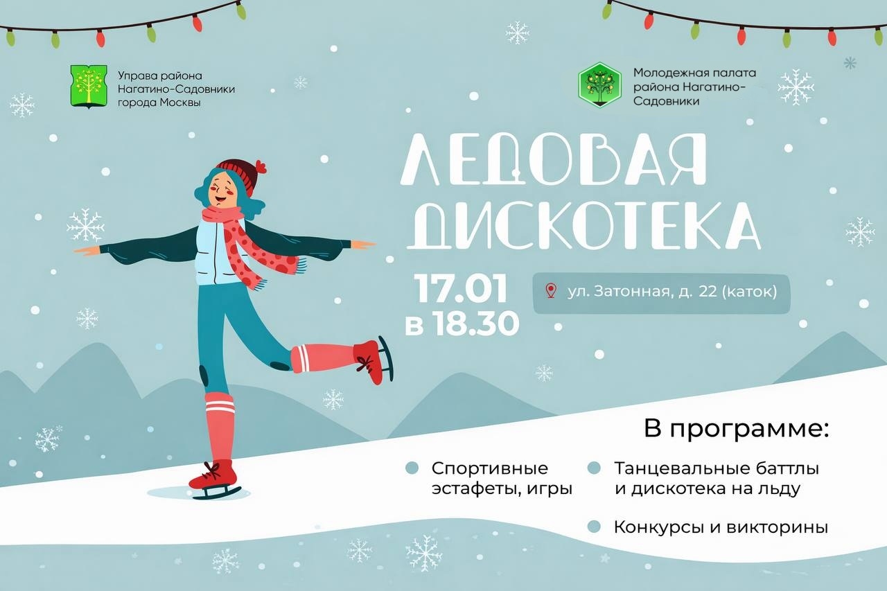 Полюбившаяся ледовая дискотека Молодежной палаты (https://t.me/molparlam_Nagatino_Sadovniki) пройдет на площадке проекта «Зима в Москве» в районе Нагатинский затон.