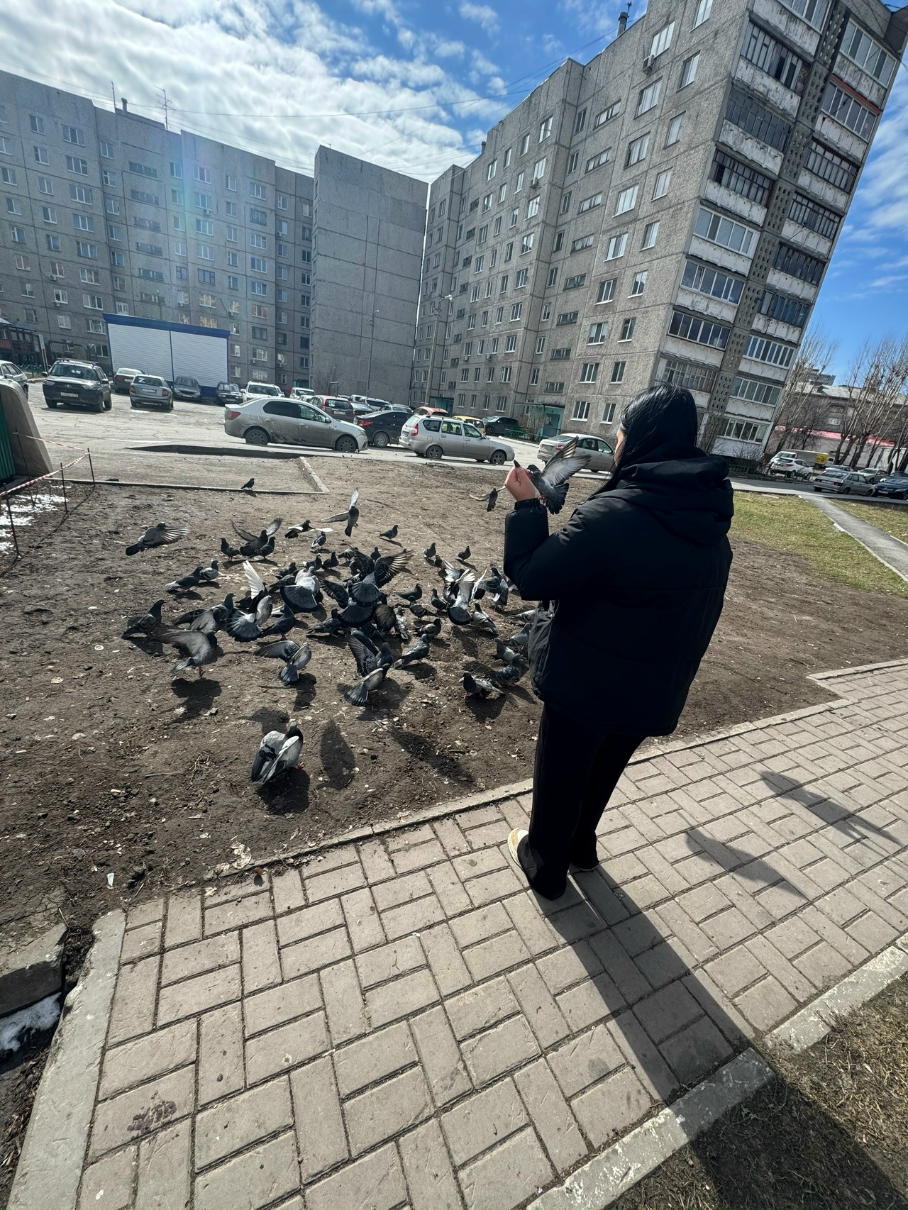 Калинина Дарья накормила городских голубей. Они слетелись со всех сторон, громко воркуя и хлопая крыльями. Сегодня их семечки нашлись.