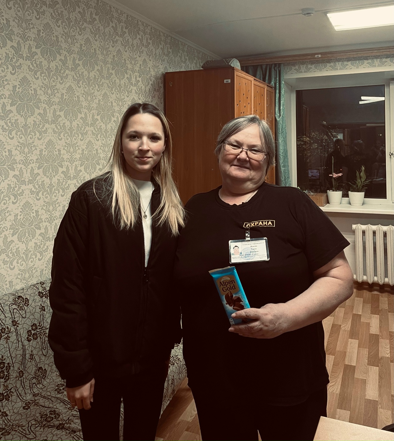 Димитриева Ирина, подарила улыбку нашей доброй и замечательной охраннице Жуковой Елене Ивановне, которая контролирует порядок в общежитии.
