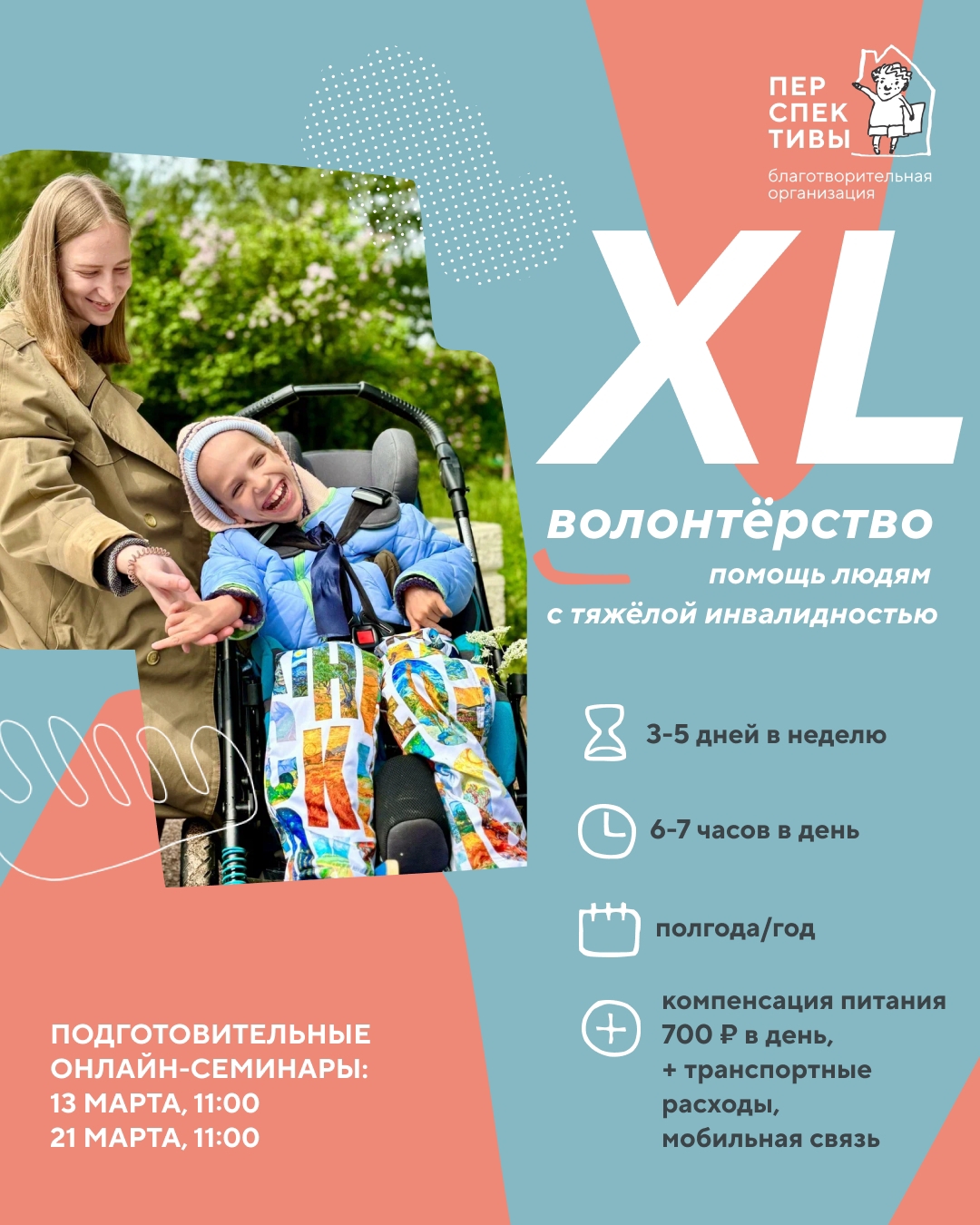 «Перспективы» уже 30 лет поддерживают детей и взрослых с тяжёлой инвалидностью. Волонтёры помогают подопечным в семьях, в детских домах-интернатах и психоневрологических интернатах (сейчас они называются дома социального обслуживания) — в быту, поездках, организации досуга. Эта помощь даёт родителям необходимую передышку, а людям в интернатах — возможность жить насыщенно и чувствовать себя нужными. Волонтёр эксклюзивной программы (XL) становится помощником особенного человека на 3–5 раз в неделю по 6–7 часов.
