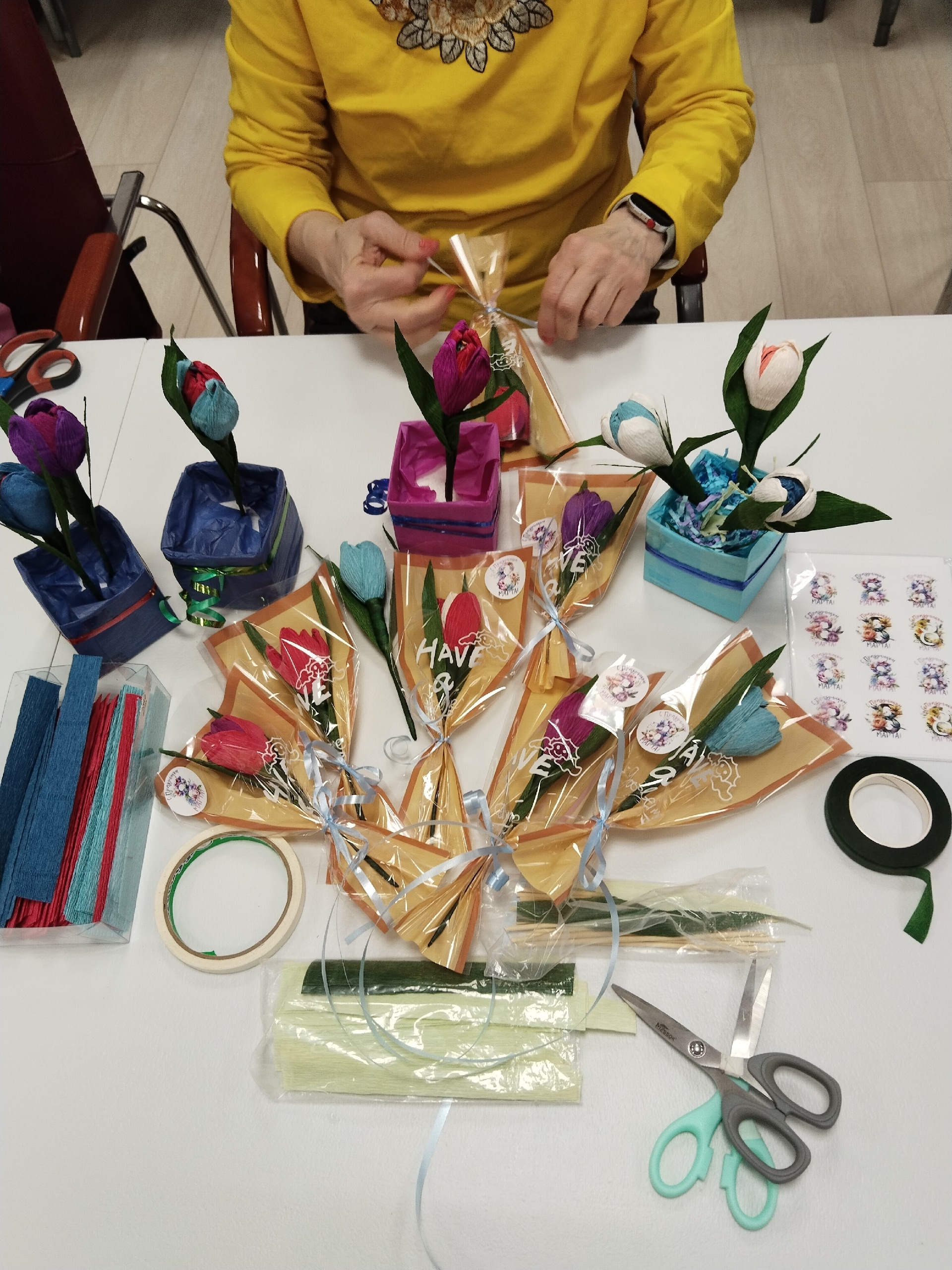 Наши замечательные Серебряные волонтёры организовали в Кризисном центре помощи женщинам увлекательный мастер-класс по созданию особенного подарка для любимых мам и дорогих женщин - букета ручной работы из конфет.