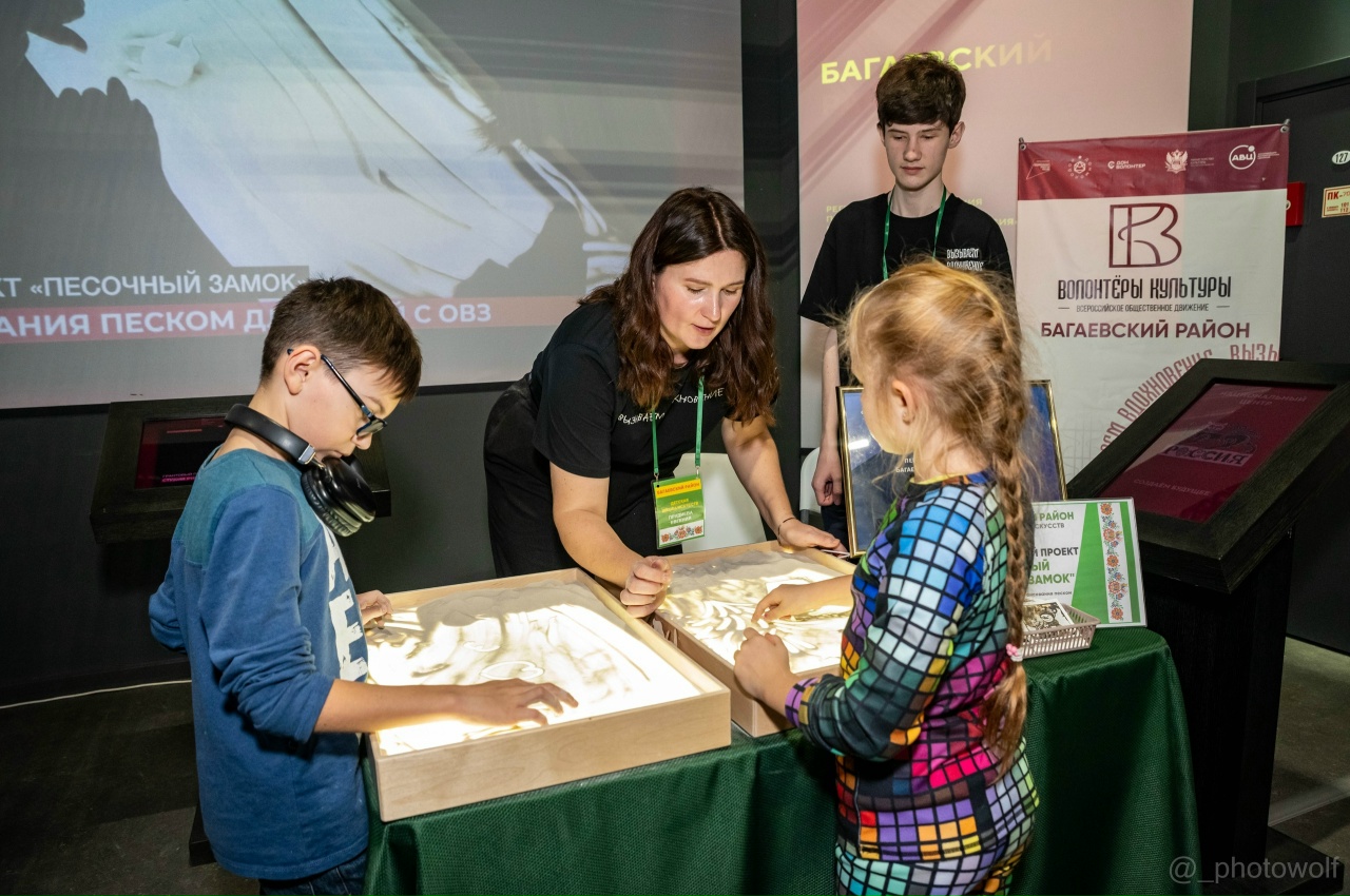 Первая это мастер-класс рисования песком на световом столе и презентация грантового проекта студии семейного рисования для детей с ОВЗ «Песочный замок». Гости мероприятия с большим удовольствием пробовали рисовать на песке. Каждый участник м/к получил открытку с работами воспитанников студии и подарком 3 видео-уроками по песочной анимации.В этот день работала выставка детских работ обучающихся ДШИ «Герои живы пока мы о них помним..» портреты земляков -участников СВО.
