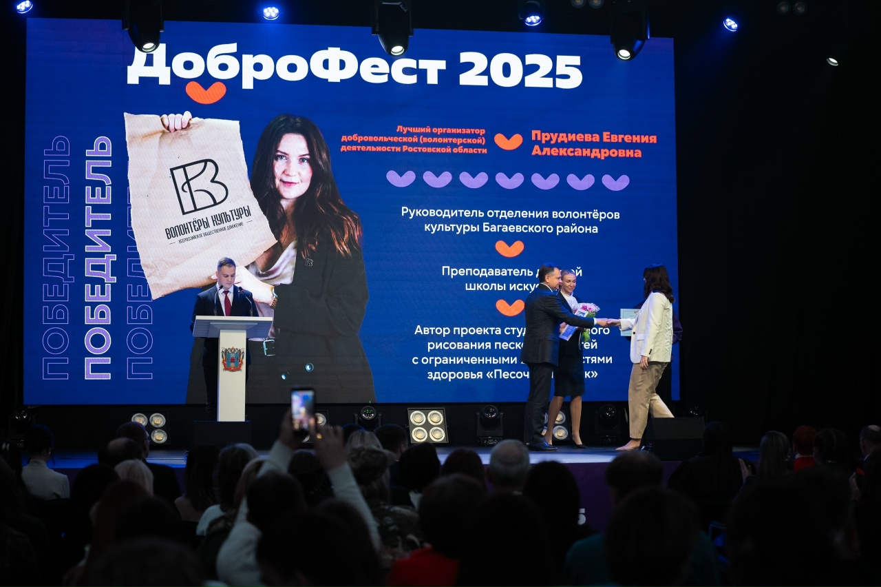 Распоряжением Правительства Ростовской области от 02.12.2025 №309 звание «Лучший доброволец (волонтер) Ростовской области» присвоено в номинации «Лучший организатор добровольческой (волонтерской) деятельности Ростовской области» 5 организаторам, в том числе руководителю отделения Волонтеров культуры Багаевского района Прудиевой Евгении Александровне.8 декабря со сцены регионального фестиваля добровольчества «ДоброФэст-2025» губернатор Ростовской области Юрий Борисович Слюсарь лично вручил Грамоту и значок добровольца Евгении Александровне. Энергия и доброта- сила Багаевского района!