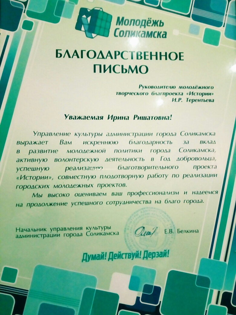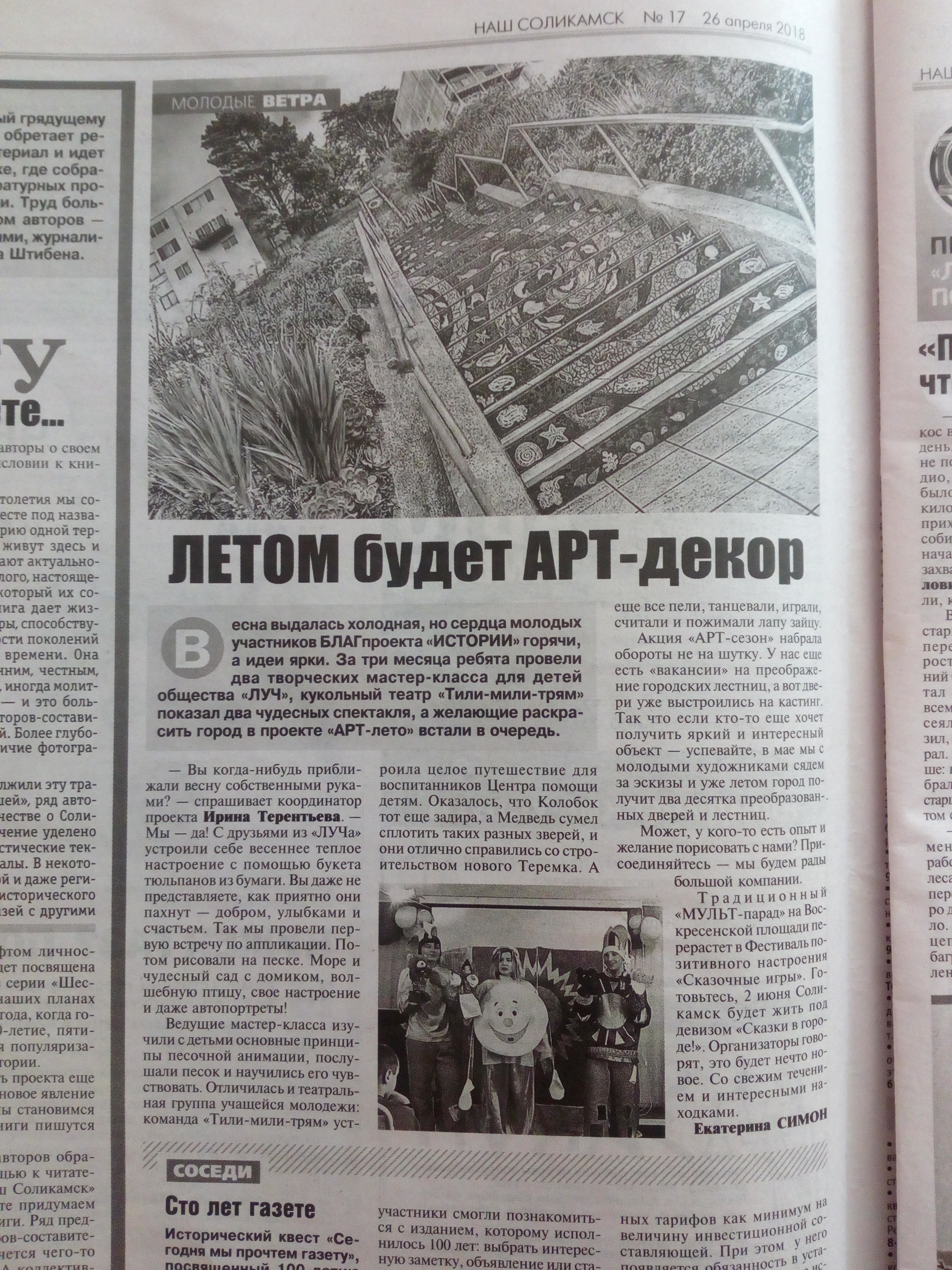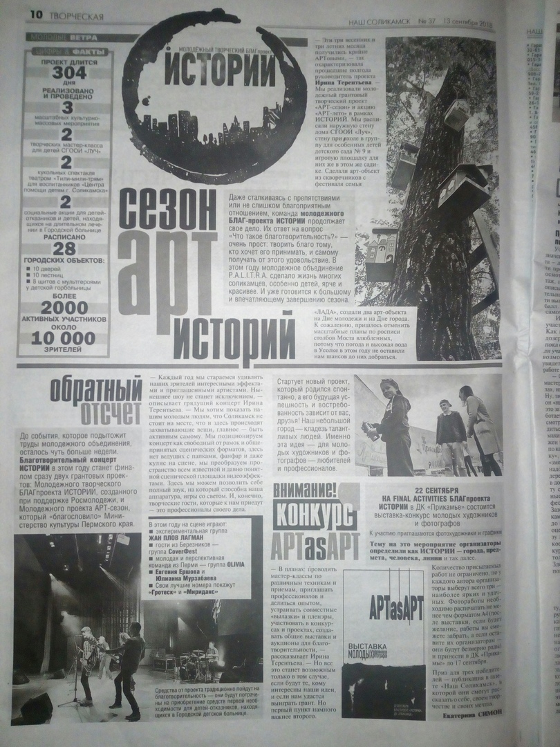 ГБУЗ «Детская городская больница» новогодняя развлекательная программа «Молодежь для молодых» - для детей, находящихся на длительном пребывании в стационаре по различным причинам, была проведена театрализованная программа с участием сказочных героев, Деда Мороза и Снегурочки. Игры, конкурсы и танцы – стали основной составляющей программы. И конечно каждый ребенок получил от Деда Мороза подарок – шоколад, фломастеры и альбомы для рисования. Участниками акции стали 40 детей и подростков разного возраста, организаторами выступил Городской совет учащейся молодежи «P.A.L.I.T.R.A.». Новогодние театрализованные представления «ОколоСКАЗОЧНАЯ история» для детей и молодежи "Луча" и детей СОП. Зрителями на двух представлениях стало более 700 человек – дети и молодежь категории СОП и дети и молодежь Соликамского городского общества инвалидов «ЛУЧ». Участниками представлений стало 84 человека – творческие коллективы, специалисты ДК «Прикамье», ГСУМ «P.A.L.I.T.R.A.». Спектакли кукольного театра «Тили-мили-трям» для детского дома. Для воспитанников «Центра помощи детям» подобные кукольные спектакли оказались в новинку. Они с интересом следили за тем, как артисты управляются с куклами, как играют голосом. Провели два выездных спектакля: «Колобок» и «Теремок». Всего оба спектакля посетило 50 человек. Творческие мастер-классы для детей и молодёжи Соликамской городской общественной организации инвалидов «ЛУЧ». Провели четыре мастер-класса, два из них по аппликации и два по песочной анимации. Посетило мастер-классы, как и планировалось 120 человек. Из-за большого количества участников мастер-классы пришлось разделить на два и проводить друг за другом, чтобы доступнее объяснять материал. Молодежная социальная акция «МУЛЬТ-парад» - расписано 8 щитов с изображение мультипликационных героев с двух сторон, чтобы и с главного входа и с окон больницы можно было смотреть на картинки. Для скорейшего выздоровления, маленьким пациентам необходимы положительные эмоции, кукольный спектакль и игровая программа с небольшими подарками отлично для этого подходят. Всего в мероприятии приняло участие 50 человек (20 игровая программа и 30 кукольный спектакль). АРТ-фестиваль детства и молодежи. Из-за погодных условий, 1 июня в Соликамске шел снег, мероприятие с городской площади пришлось перенести в здание ДК «Прикамье», но масштабности оно не потеряло. Все, что задумали, сумели уместить в здании. За 5 часов мероприятие посетило 3000 человек участниками интерактивов стали более 1000 человек. Акция «АРТ-лето» Молодые художники и активисты превратили 10 городских дверей и лестниц в объекты уличного искусства. Состоялся настоящий «кастинг», по результатам которого были выбраны социально-значимые объекты города. Город стад ярче, интереснее и красочнее. По итогам акции расписаны следующие объекты: ДК «Прикамье», бассейн «Здоровье», детский сад №9, группа для детей-инвалидов, дом СГООИ «ЛУЧ», МАОУ «СОШ№17», детский сад №47, Библиотека семейного чтения, МАУК «Соликамский горизонт», МБУК «Детская художественная школа». Итоговая концертная программа «ИСТОРИИ» Итоговое мероприятие проекта стало самым ярким и молодежным этапом. Участниками итогового мероприятия стало 100 молодых людей. Зрителями 300 человек, из них молодежи категории СОП - 26 человек. Участники фотовыставки и выста