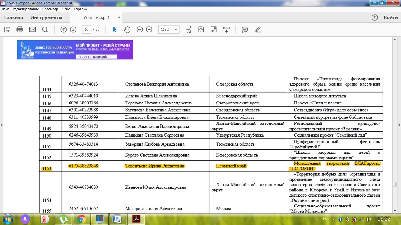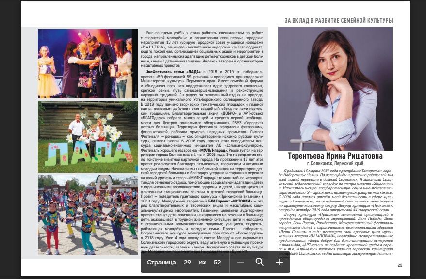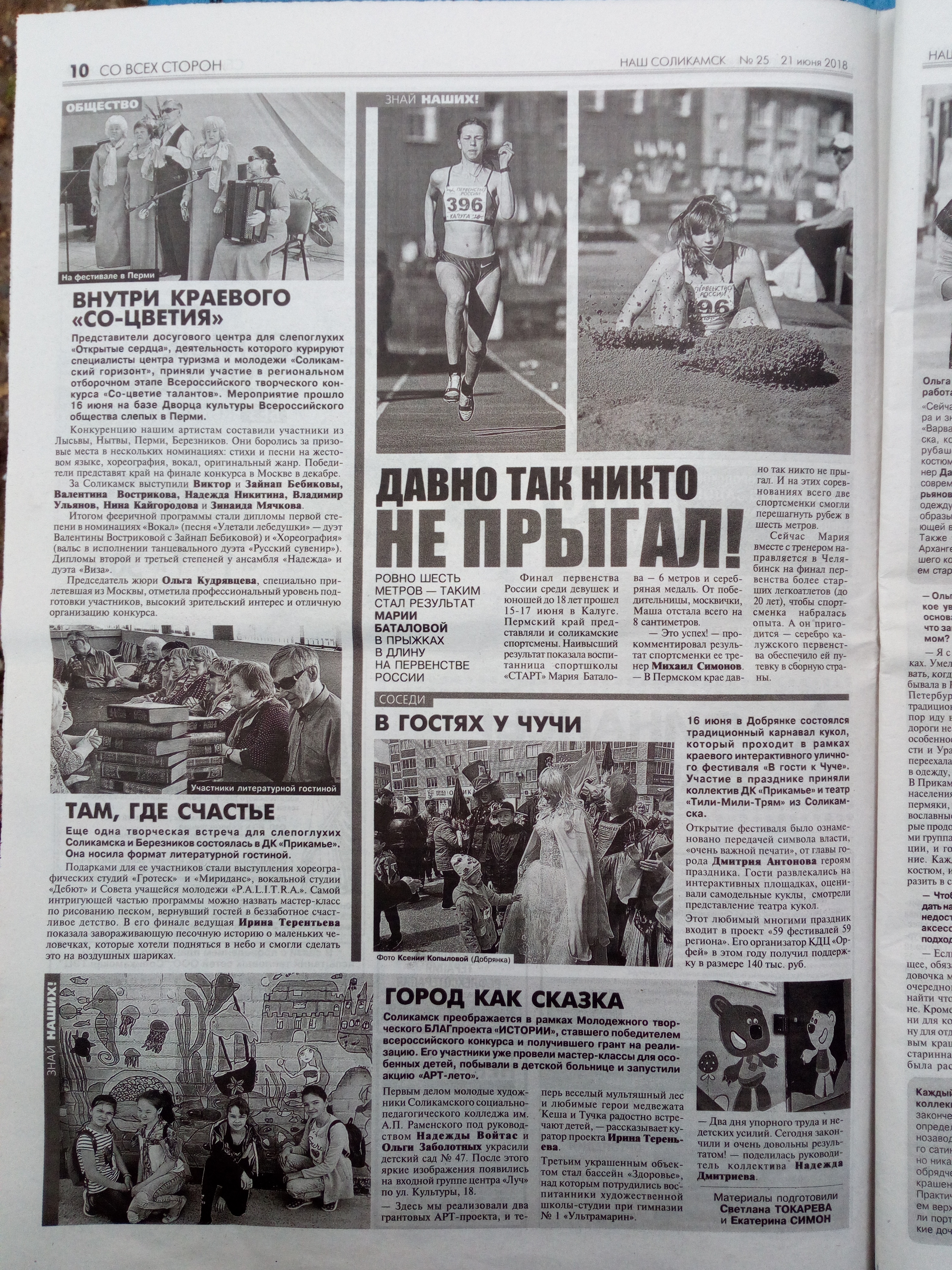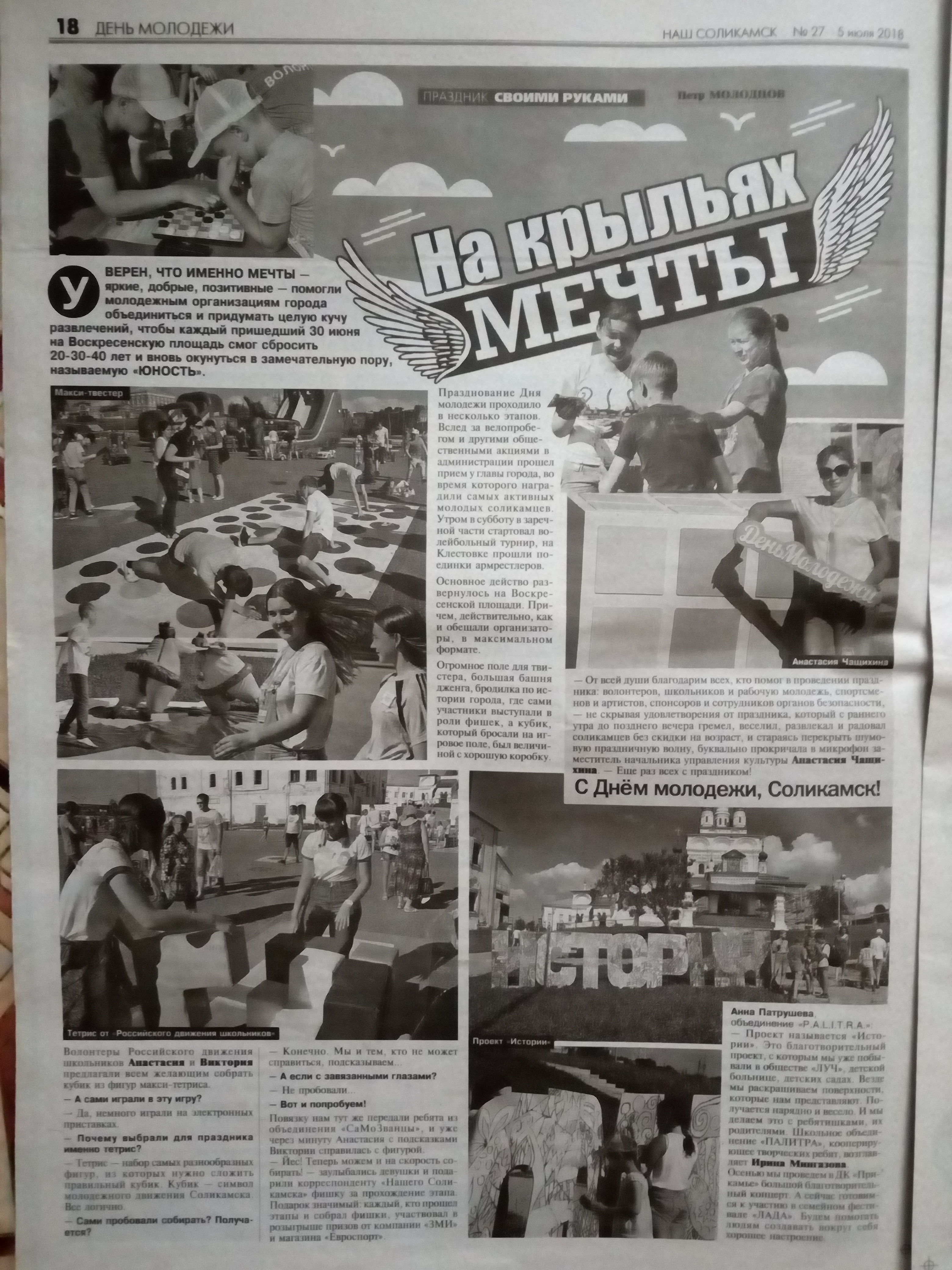 ГБУЗ «Детская городская больница» новогодняя развлекательная программа «Молодежь для молодых» - для детей, находящихся на длительном пребывании в стационаре по различным причинам, была проведена театрализованная программа с участием сказочных героев, Деда Мороза и Снегурочки. Игры, конкурсы и танцы – стали основной составляющей программы. И конечно каждый ребенок получил от Деда Мороза подарок – шоколад, фломастеры и альбомы для рисования. Участниками акции стали 40 детей и подростков разного возраста, организаторами выступил Городской совет учащейся молодежи «P.A.L.I.T.R.A.». Новогодние театрализованные представления «ОколоСКАЗОЧНАЯ история» для детей и молодежи "Луча" и детей СОП. Зрителями на двух представлениях стало более 700 человек – дети и молодежь категории СОП и дети и молодежь Соликамского городского общества инвалидов «ЛУЧ». Участниками представлений стало 84 человека – творческие коллективы, специалисты ДК «Прикамье», ГСУМ «P.A.L.I.T.R.A.». Спектакли кукольного театра «Тили-мили-трям» для детского дома. Для воспитанников «Центра помощи детям» подобные кукольные спектакли оказались в новинку. Они с интересом следили за тем, как артисты управляются с куклами, как играют голосом. Провели два выездных спектакля: «Колобок» и «Теремок». Всего оба спектакля посетило 50 человек. Творческие мастер-классы для детей и молодёжи Соликамской городской общественной организации инвалидов «ЛУЧ». Провели четыре мастер-класса, два из них по аппликации и два по песочной анимации. Посетило мастер-классы, как и планировалось 120 человек. Из-за большого количества участников мастер-классы пришлось разделить на два и проводить друг за другом, чтобы доступнее объяснять материал. Молодежная социальная акция «МУЛЬТ-парад» - расписано 8 щитов с изображение мультипликационных героев с двух сторон, чтобы и с главного входа и с окон больницы можно было смотреть на картинки. Для скорейшего выздоровления, маленьким пациентам необходимы положительные эмоции, кукольный спектакль и игровая программа с небольшими подарками отлично для этого подходят. Всего в мероприятии приняло участие 50 человек (20 игровая программа и 30 кукольный спектакль). АРТ-фестиваль детства и молодежи. Из-за погодных условий, 1 июня в Соликамске шел снег, мероприятие с городской площади пришлось перенести в здание ДК «Прикамье», но масштабности оно не потеряло. Все, что задумали, сумели уместить в здании. За 5 часов мероприятие посетило 3000 человек участниками интерактивов стали более 1000 человек. Акция «АРТ-лето» Молодые художники и активисты превратили 10 городских дверей и лестниц в объекты уличного искусства. Состоялся настоящий «кастинг», по результатам которого были выбраны социально-значимые объекты города. Город стад ярче, интереснее и красочнее. По итогам акции расписаны следующие объекты: ДК «Прикамье», бассейн «Здоровье», детский сад №9, группа для детей-инвалидов, дом СГООИ «ЛУЧ», МАОУ «СОШ№17», детский сад №47, Библиотека семейного чтения, МАУК «Соликамский горизонт», МБУК «Детская художественная школа». Итоговая концертная программа «ИСТОРИИ» Итоговое мероприятие проекта стало самым ярким и молодежным этапом. Участниками итогового мероприятия стало 100 молодых людей. Зрителями 300 человек, из них молодежи категории СОП - 26 человек. Участники фотовыставки и выста