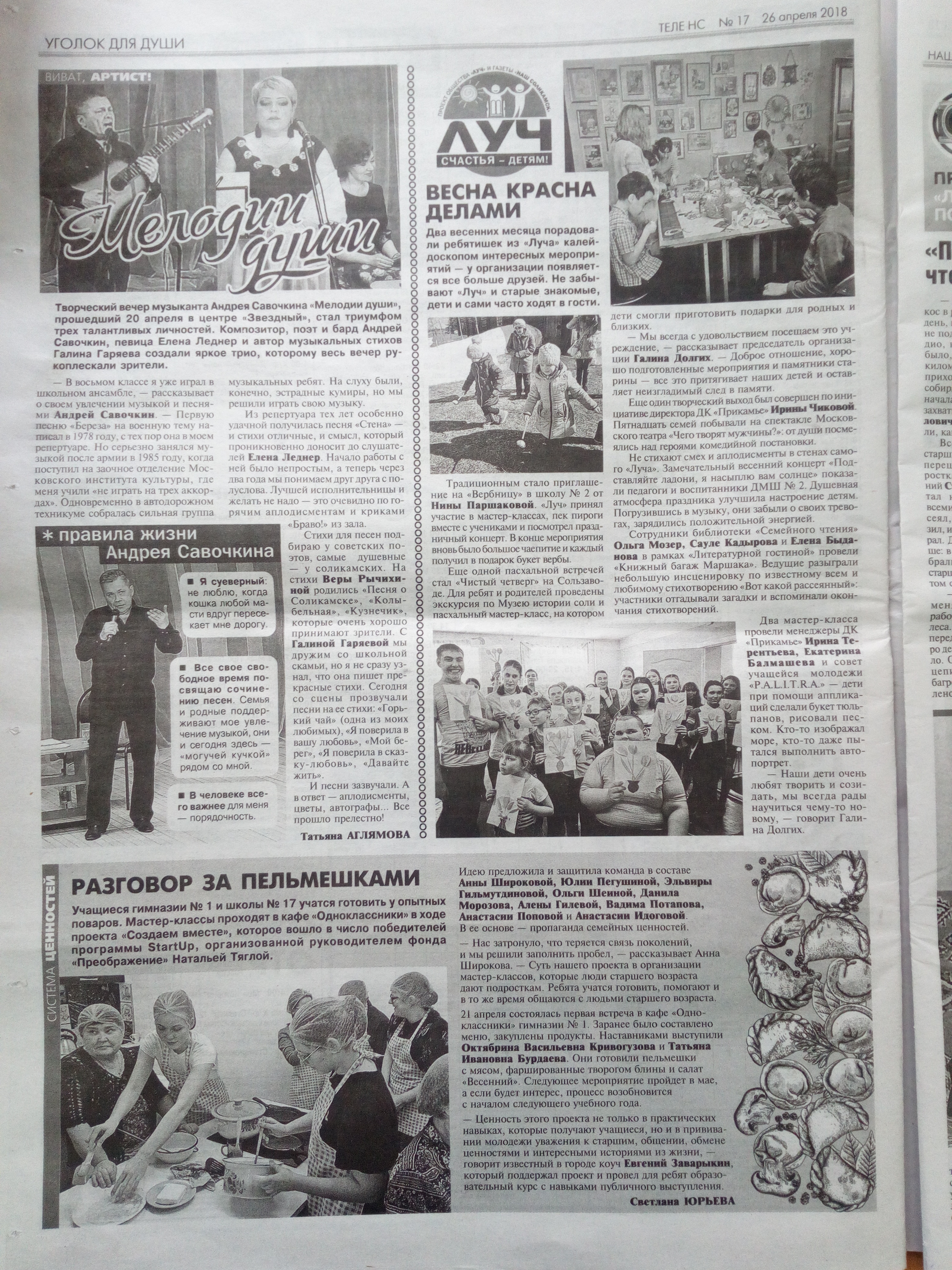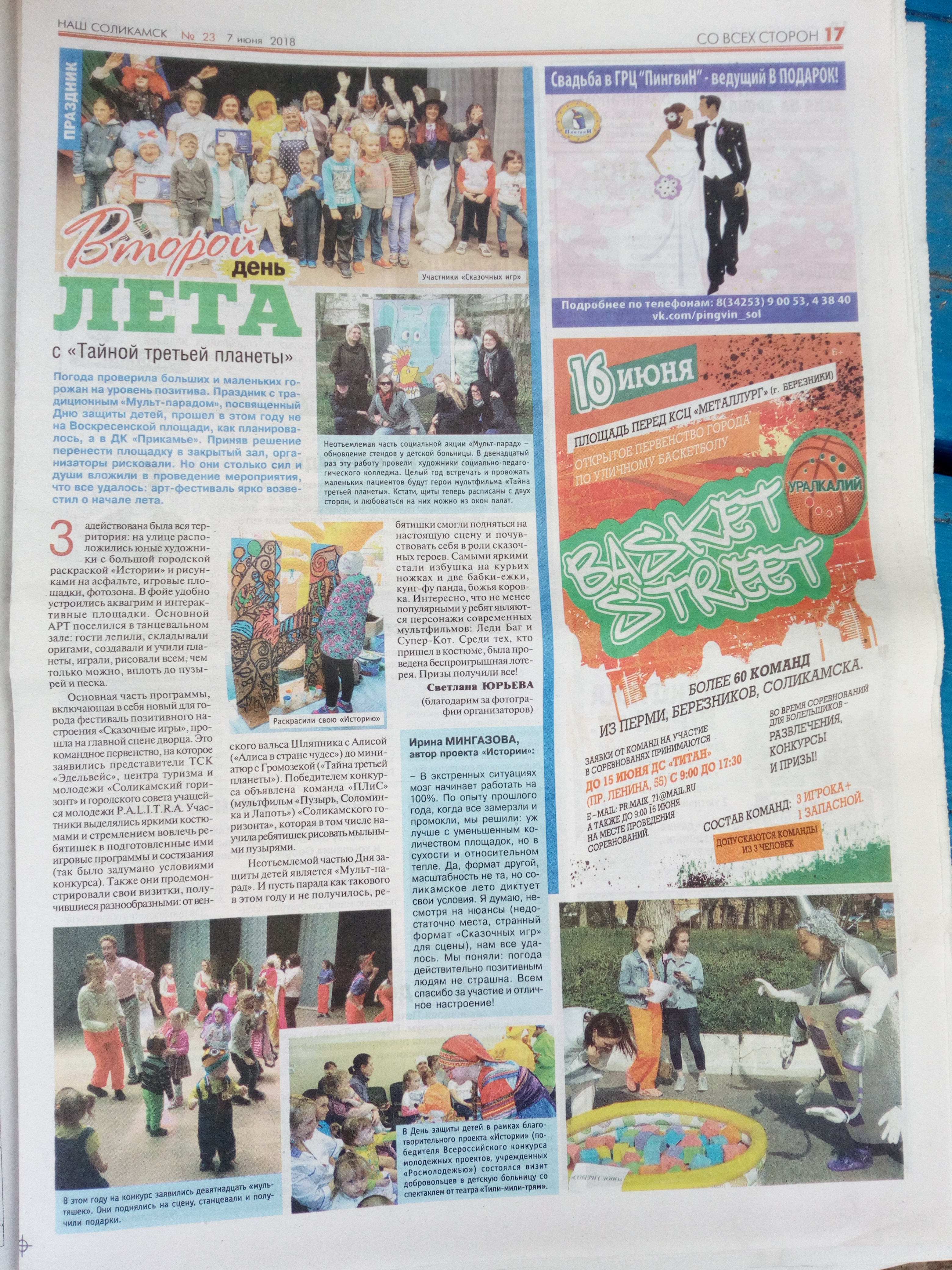 Молодежный творческий БЛАГпроект "ИСТОРИИ" - это ряд благотворительных и творческих акций и масштабных социально-культурных мероприятий. Основной организатор и реализатор проекта - это творческая молодежь, которая хочет развиваться, самовыражаться и помогать окружающим. Главными целевыми аудиториями проекта стали дети-отказники, находящиеся на лечении в больнице; дети, оказавшиеся в трудной жизненной ситуации; дети и молодежь с ограниченными возможностями здоровья; учащиеся, студенты, работающая молодежь и молодые семьи. В рамках реализации Проекта "ИСТОРИИ" в ГБУЗПК «Городская детская больница» прошли игровые театрализованные программы для детей, находящихся на длительном стационарном лечении, детей-отказников, и детей, находящихся на временном пребывании в лечебном заведении при передачи их в дом малютки или детский дом. Волонтеры Городского совета учащейся молодежи «P.A.L.I.T.R.A.» приезжали в больницу под Новый год с театрализованной игровой программой, с Дедом Морозом и Снегурочкой, поздравили ребят, поиграли с ними и подарили подарки. Вторая игровая программа в детской больнице прошла 1 июня и была приурочена ко Дню защиты детей, волонтеры так же провели развлекательное театрализованное мероприятие с подарками для детей больницы. Студенты «Соликамского социально-педагогического колледжа», представители ГСУМ «P.A.L.I.T.R.A.» провели два творческих мастер-класса для детей и молодежи Общества инвалидов «Луч»: песочная анимация и аппликация. Для особенных детей это очень хорошие и полезные упражнения, на развитие мелкой моторики, тактильные ощущения, развитие воображения и фантазии. Занятия творчеством помогают детям и молодым людям выразить свои чувства, раскрыть свой потенциал, а поскольку с обеими техниками весьма несложно справиться, то интерес к ним был большой. Два спектакля «Теремок» и «Колобок» кукольного театра «Тили-мили-трям» были показаны деткам из "Центра помощи детям Соликамска", артисты театра выезжали с представлениями непосредственно в помещение Центра. В рамках «ИСТОРИЙ» состоялись 3 масштабных городских мероприятия. Первым из них стало Новогоднее театрализованное представление «ОколоСКАЗОЧНАЯ история» для детей и молодежи "Луча" и детей СОП. Прошли представления на сцене МАУК ДК «Прикамье» зрителями стали около 700 человек. Мероприятие представляло собой театрализованную музыкальную сказку с выступлениями творческих коллективов города, игровой программой от Деда Мороза и Снегурочки. На сцене в роли персонажей сказки выступали представители ГСУМ «P.A.L.I.T.R.A.», специалисты ДК «Прикамье». Перед представлением в фойе ДК проходила интерактивная программа с различными мастер-классами, играми и показами мультфильмов. Второе массовое общегородское мероприятие состоялось 2 июня, из-за погодных условий, в ДК "Прикамье" - АРТ-фестиваль детства и молодежи "Наше время" . Он прошел в 2 самостоятельных этапа, объединенных одной темой – «Детство и добро.» Первый этап. Молодежная социальная акция «МУЛЬТ-парад» Для проведения первого этапа акции, который состоялся на территории детской городской больницы, осуществлялась работа со студентами ГБПОУ «Соликамский социально-педагогический колледж им.А.П. Раменского». Они разрабатывали эскизы с изображениями мультипликационных героев, которые затем нанесли на у