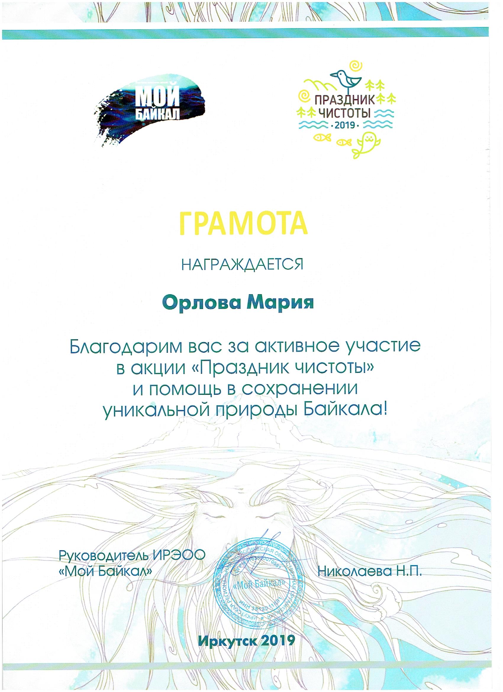 Итоги акции «Праздник чистоты»за 2019 год: Количество волонтеров, принявших участие в акции -400 человек.Общий охват акции -2000 человек.Было совершено 3 выезда по 5 дней, 2 выезда на 1 день на побережье Байкала для уборок. Общий охват территорий уборок в 2019 году-17 .На побережье Байкала убрано 2 свалки. Вывезено мусора - 29 грузовиков, собрано раздельно 2169 мешков с мусором. Роздано 500 листовок информационного характера. Акции прошли: на побережье пролива Малое Море ( п. Сахюрта – залив Куркут – залив Шида) – 22-26 мая. В поселке Хужир на острове Ольхон (зона уборки 2 км) — 5-9 июня. В поселке Листвянка (возле п. Никола) — 13 июля в деревне Сарма (Ольхонский район) — 22-26 июля. В городе Слюдянка — 17 августа.
