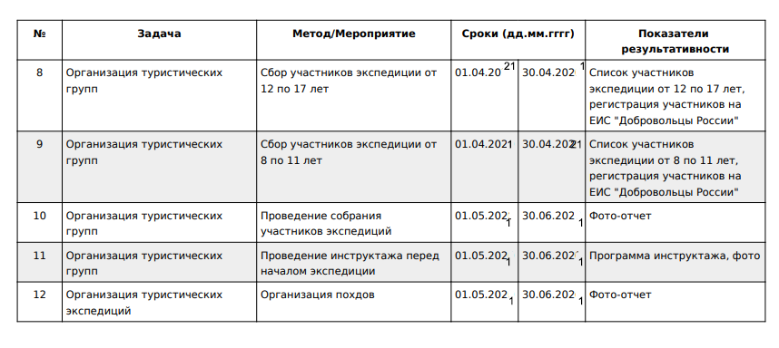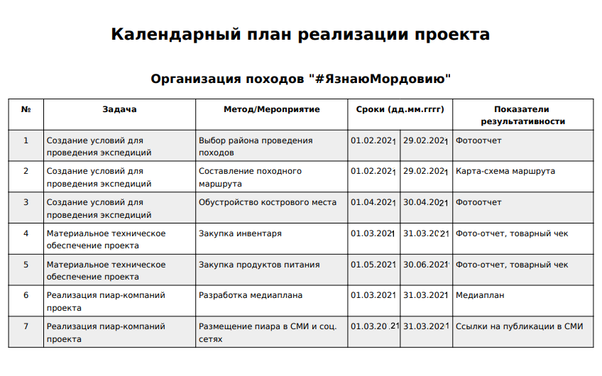 Краткая аннотация:Проект представляет собой организацию походов в весеннее и летнее время года с активистами волонтерских организаций Республики Мордовия. Он направлен на изучение различных территорий родного края, в нашем случае – Республики Мордовия, людей школьного возраста - от 8 до 18 лет. В рамках походов будут осуществлены сборы мусора для дальнейшей утилизации. Будут организованы походы для учеников средней школы (12-17 лет) и для учеников начальных классов (8-11 лет). Походы будут осуществляться с мая по июнь 2021-года. Это мероприятие будет проводиться ежегодно. Во время каждого похода будут проводиться различные мастер-классы и квесты. В отличие от младших групп, старшие группы отправятся в поход с ночевкой на 2 ночи при присмотре инструктора.