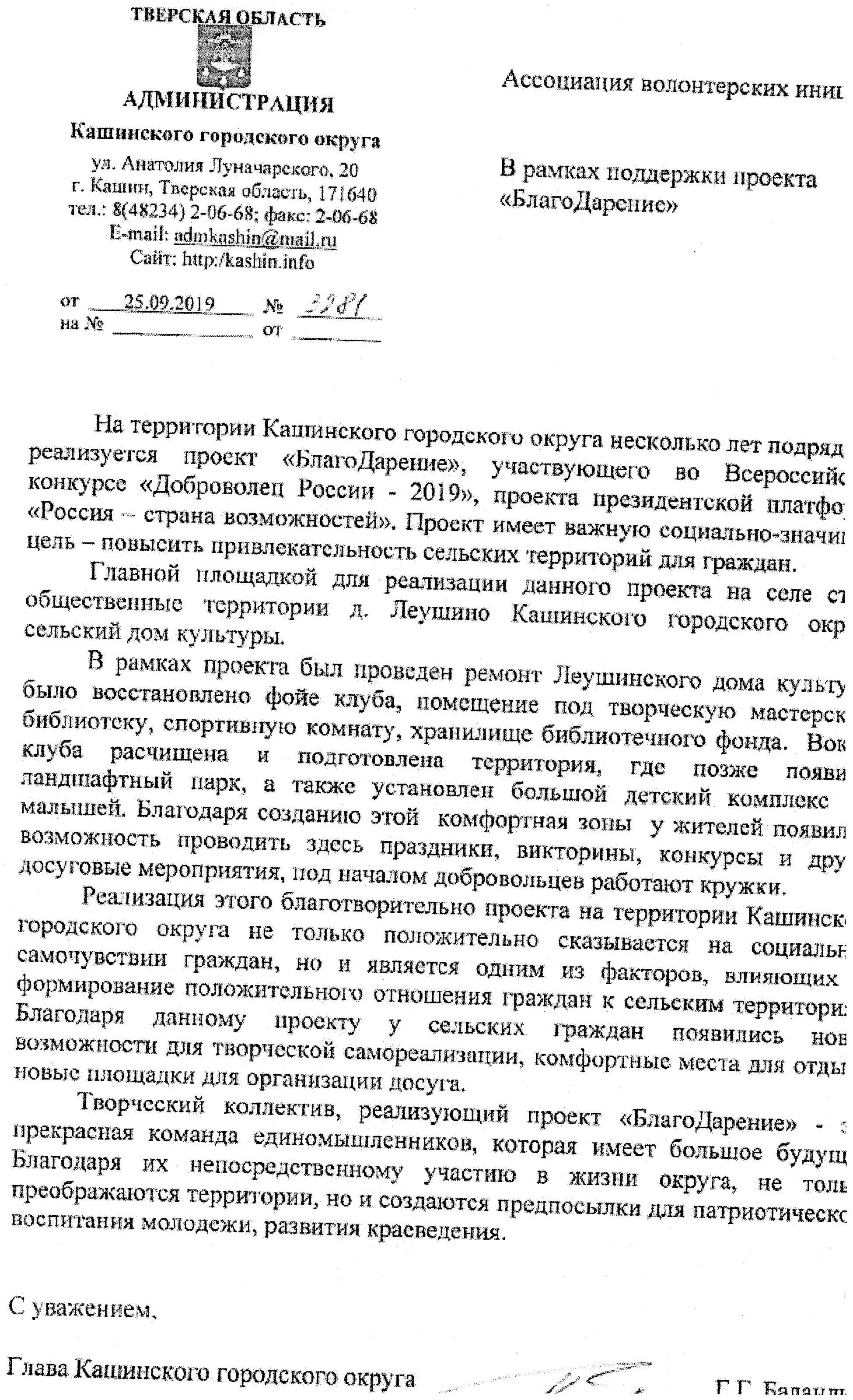 Площадкой для реализации данного проекта стала и территория д.Леушино Кашинского городского округа, в частности, сельский дом культуры - единственный доступный центр культуры для многих окрестных сел и деревень. Мы сделали частичный ремонт Леушинского ДК. Художественно оформили фойе, помещение под Творческую Мастерскую, отремонтировали и открыли литературно - музыкальную гостиную, спортивная комнату. Сейчас ремонтируется комната для библиотечного фонда. Благодаря этому, у жителей появилась возможность проводить здесь культурный досуг: праздники, концерты, литературно - музыкальные вечера, викторины, конкурсы, встречать гостей. Работают кружки, кукольный театр, театральная студия.