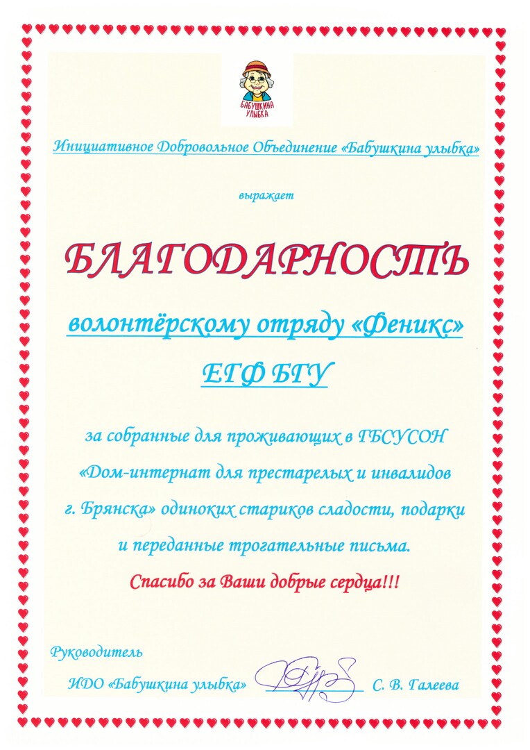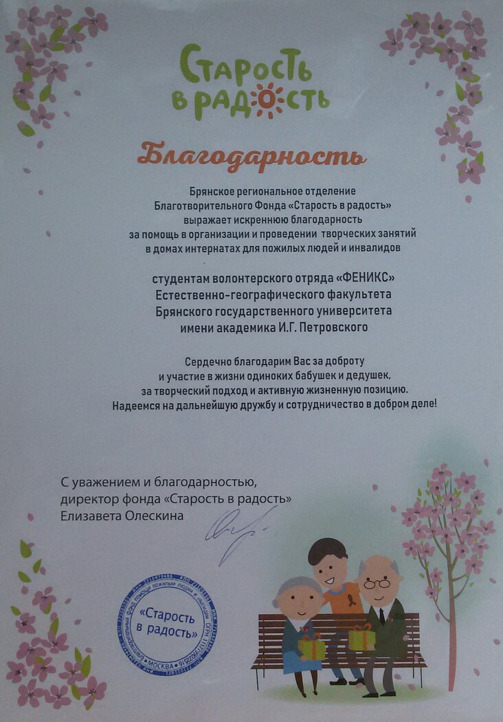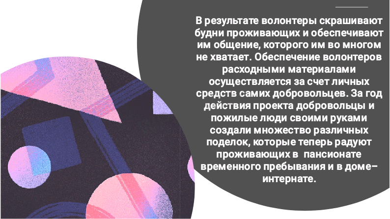 В результате волонтеры скрашивают будни проживающих и обеспечивают им общение, которого им во многом не хватает. Обеспечение волонтеров расходными материалами осуществляется за счет личных средств самих добровольцев. За год действия проекта добровольцы и пожилые люди своими руками создали множество различных поделок, которые теперь радуют проживающих в пансионате временного пребывания и в доме-интернате.