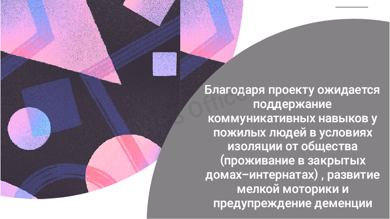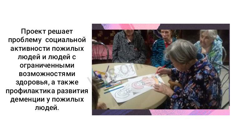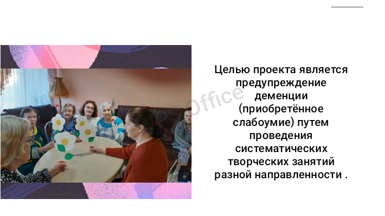 Целью проекта является предупреждение деменции (приобретённое слабоумие) путем проведения систематических творческих занятий разной направленности .