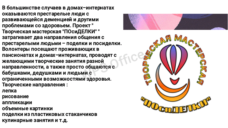 В большинстве случаев в домах-интернатах оказываются престарелые люди с развивающейся деменцией и другими проблемами со здоровьем. Проект "Творческая мастерская "ПОсиДЕЛКИ" " затрагивает два направления общения с престарелыми людьми - поделки и посиделки. Волонтеры посещают проживающих в пансионатах и домах-интернатах, проводят с желающими творческие занятия разной направленности, а также просто общаются с бабушками, дедушками и людьми с ограниченными возможностями здоровья. Творческие направления :