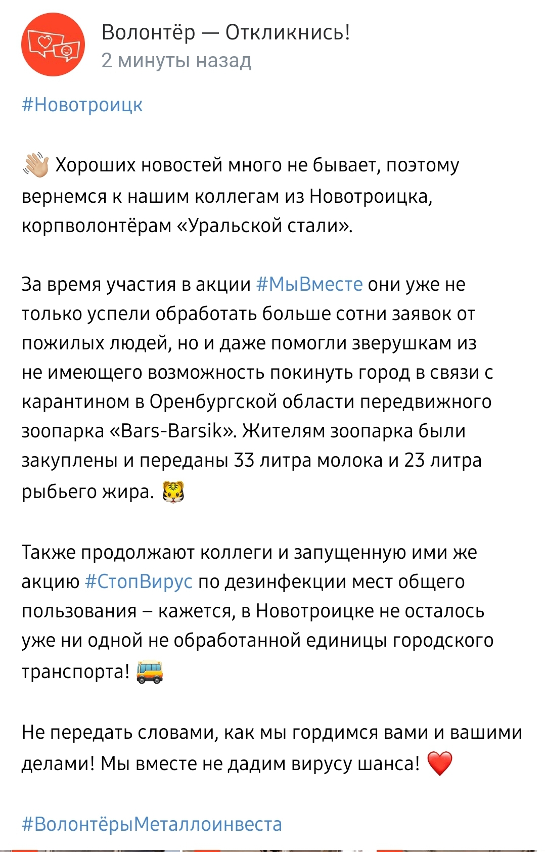 1. Создание волонтерского движения 2. Проведение акции "стоп вирус" 3. Оказание помощи властям 4. Оказание помощи в уборке и дезинфекции помещения и муниципального транспорта 5. Оказание помощи детским учреждениям и здравоохранению