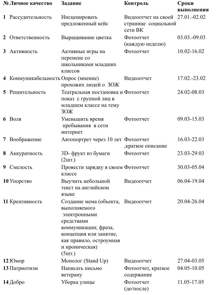 Проект «Бабочка» - это комплекс мероприятий,различной направленности направленные на «прокачку» своих качеств в период с 27 января по 17июня, что будет способствовать развитию личностных качеств участников. Этапы участники конкурса проходят заочно согласно установленным срокам. Участники должны подписаться на группу проект «Бабочка» и согласиться на получение рассылки, в которых и будет вестись переписка между организатором и участником. В начале недели участники получают новое задание для личного зачета и выполняют его в течение 5 дней. После чего присылают отчет о выполненном задании в личном сообщении. По завершению недели эксперты (жюри) подводят итоги, качество выполненной работы, участник получает определенное количество баллов за выполненное задание, где минимальный бал это 1, а максимальный 3.Каждое задание будет направлено на саморазвитие и улучшение моральных качеств.Существует ранговая система оценивания. Для достижения определённого ранга нужно набрать определенное количество баллов.1 ранг- 9 баллов 2 ранг – 21 баллов 3 ранг – 33 балла 4 ранг – 48 баллов 5 ранг – 63 баллов За переход на новый ранг участник награждается определенными отличительными символами проекта (значки, кепки, футболки).1 ранг – Блокнот, ручка2 ранг - Кепка3 ранг – Сумка - бананка4 ранг – Футболка5 ранг – Свит-шотКаждая неделя будет посвящена определенному человеческому качеству для развития своего характера и личных достоинств:-Упорство -Ответственность-Честность-Активность-Решительность-Пунктуальность-Аккуратность-Коммуникабельность-Смелость-Юмор-Воля-Креативность -Воображение-ОтзывчивостьЗадания будут высылаться автоматически каждую неделю в специальной группе социальной сети Вконтакте в личном сообщении.Отчет по каждому проведенному заданию предоставляют организатору конкурса, краткое описание, фотографии или видеоматериал (регламент видео до 3-5 минут). В течение проекта оргкомитет имеет право выкладывать лучшие работы участников в социальные сети.В дальнейшем это поможет участникам развить свои личностные качества и вступить в ряды добровольческого движения в своих поселениях.